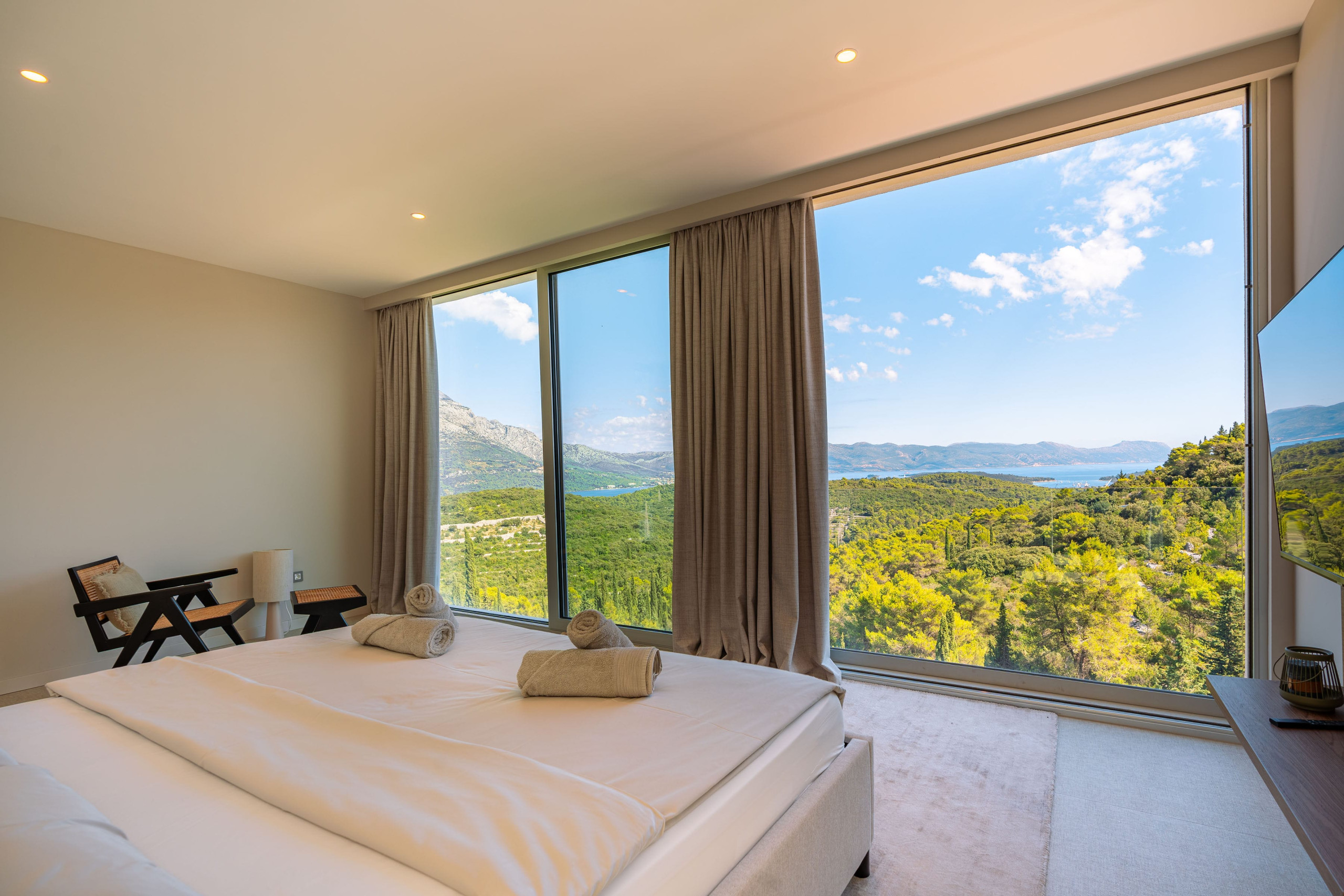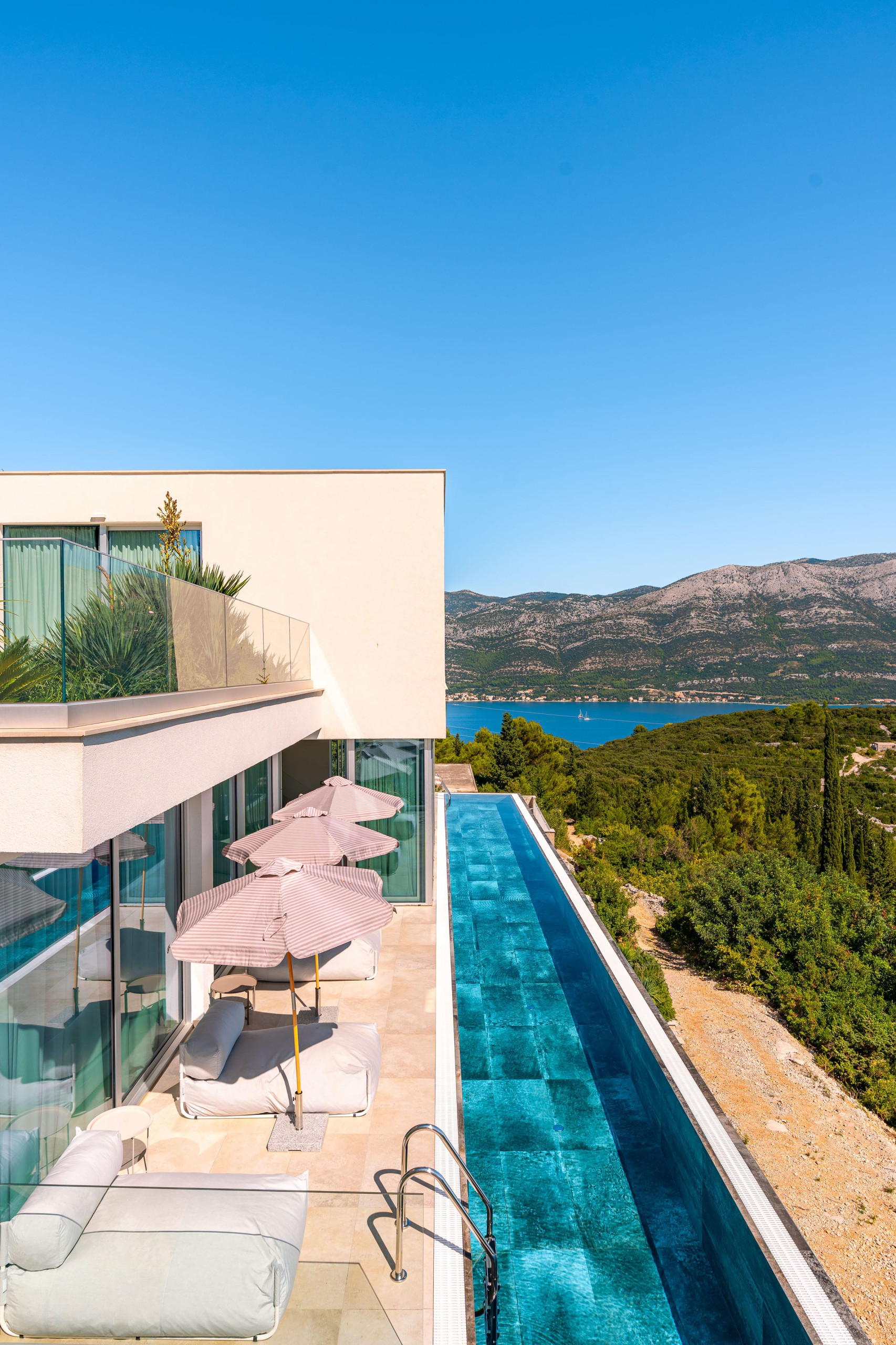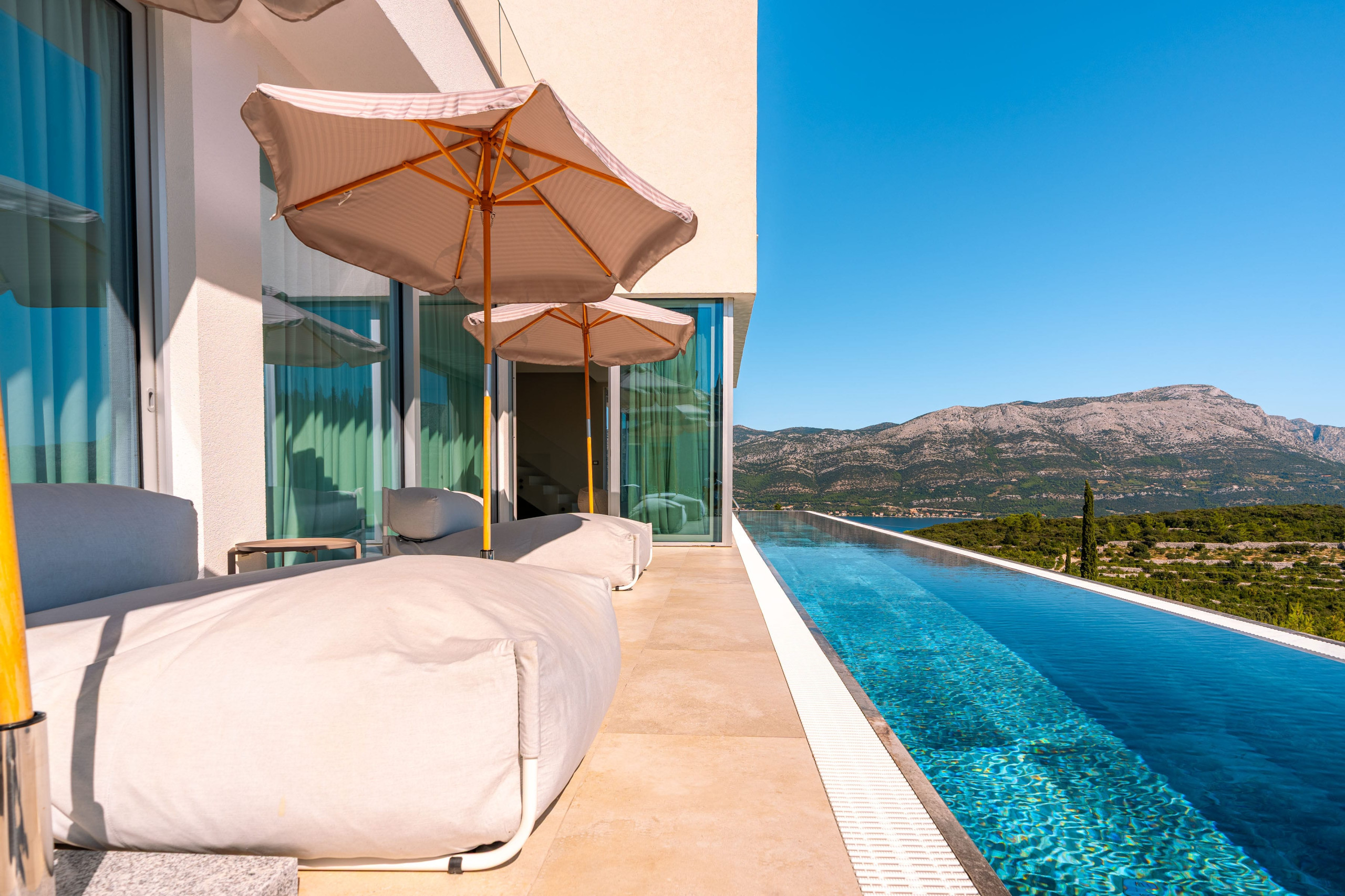 Thanks to Korčula’s mild Mediterranean climate, this villa is ideal for year-round luxury holidays. The northeast orientation ensures natural protection from intense sun, while large windows and terraces maximize the stunning panoramic views from almost every room.