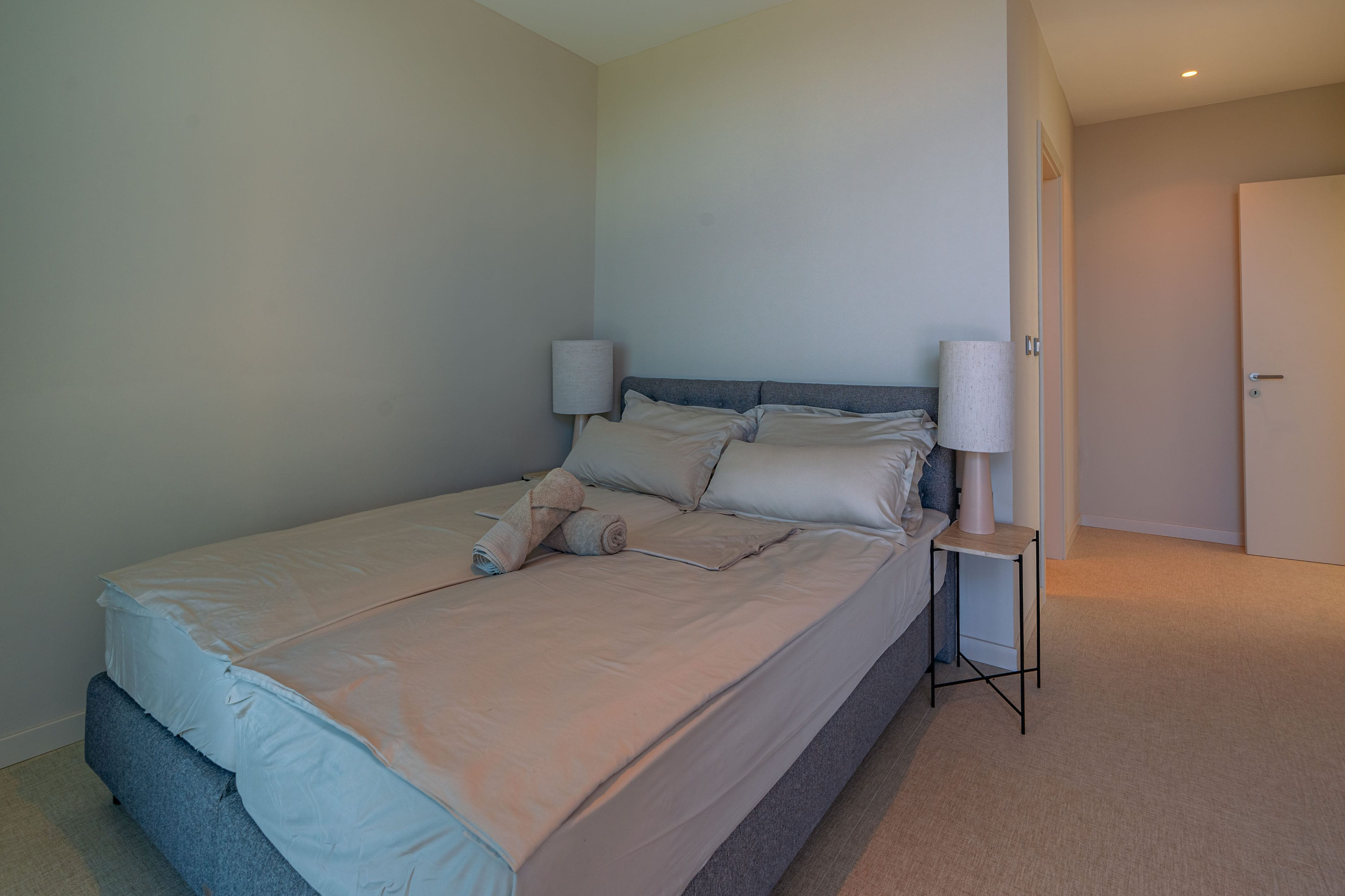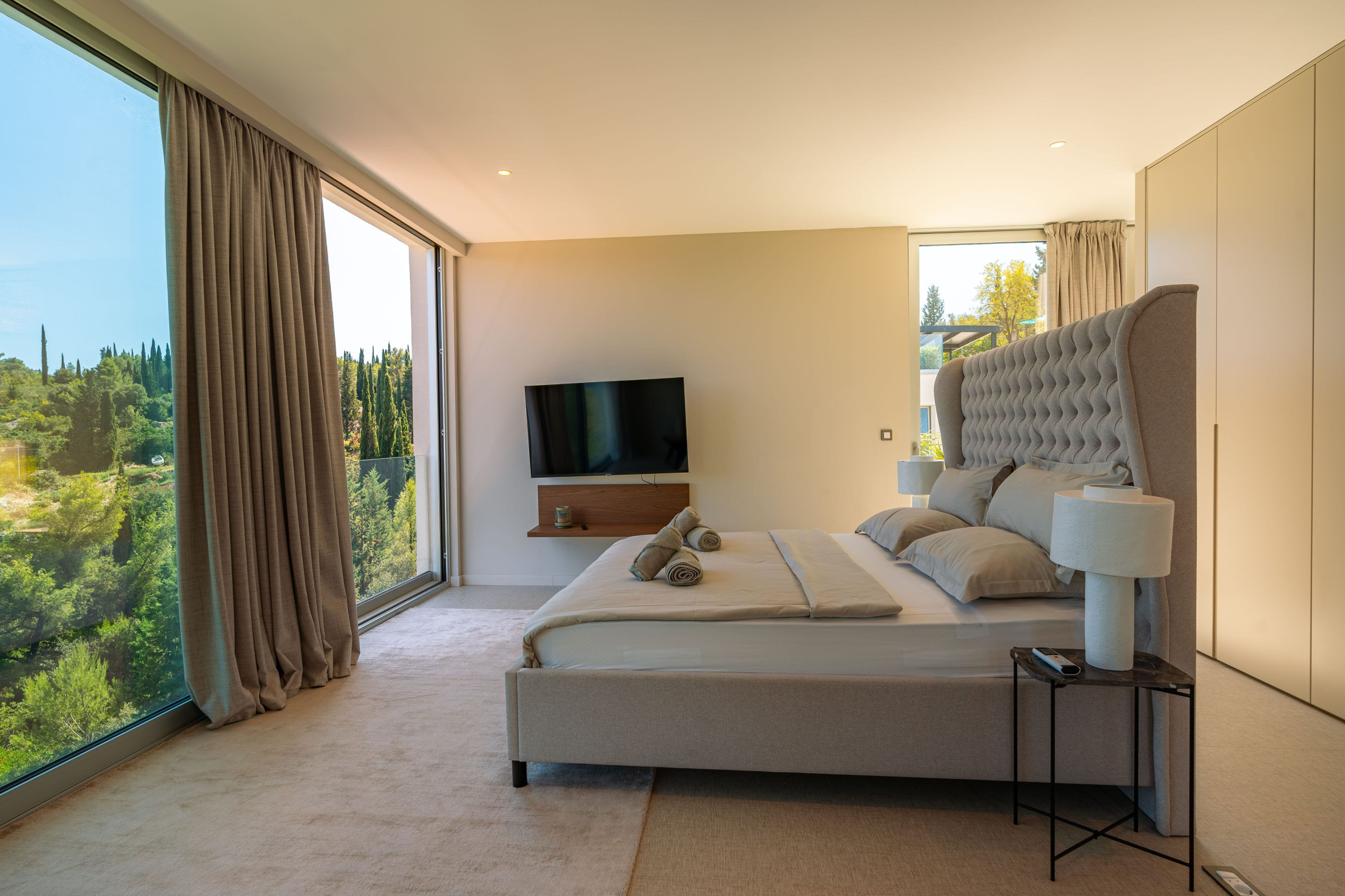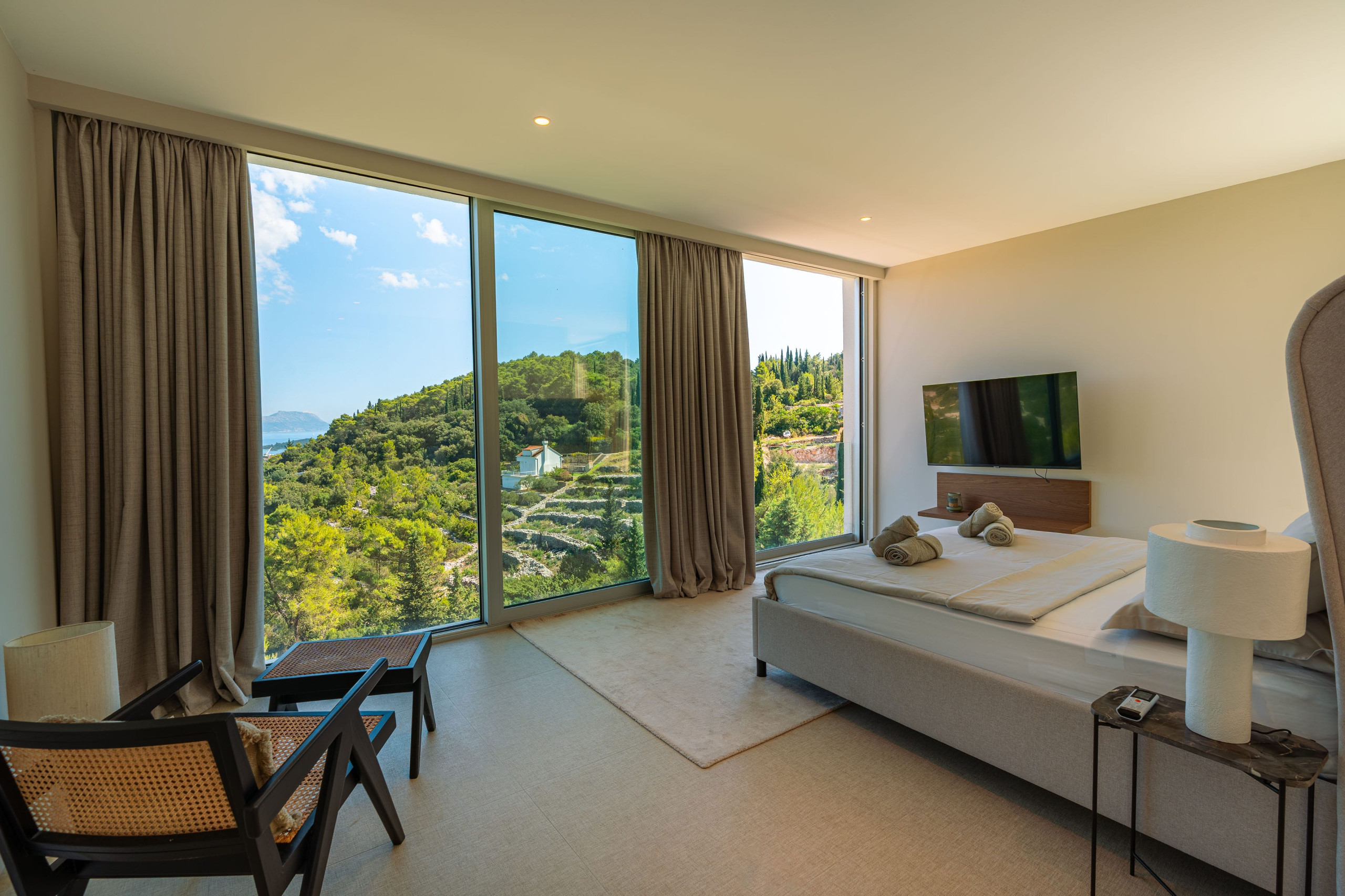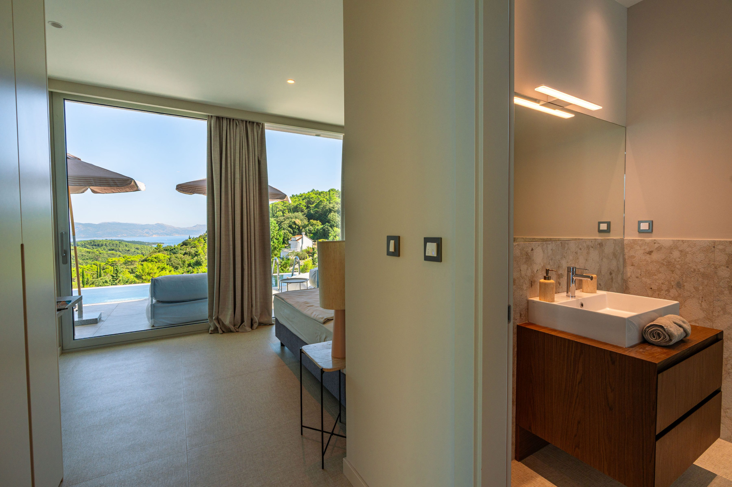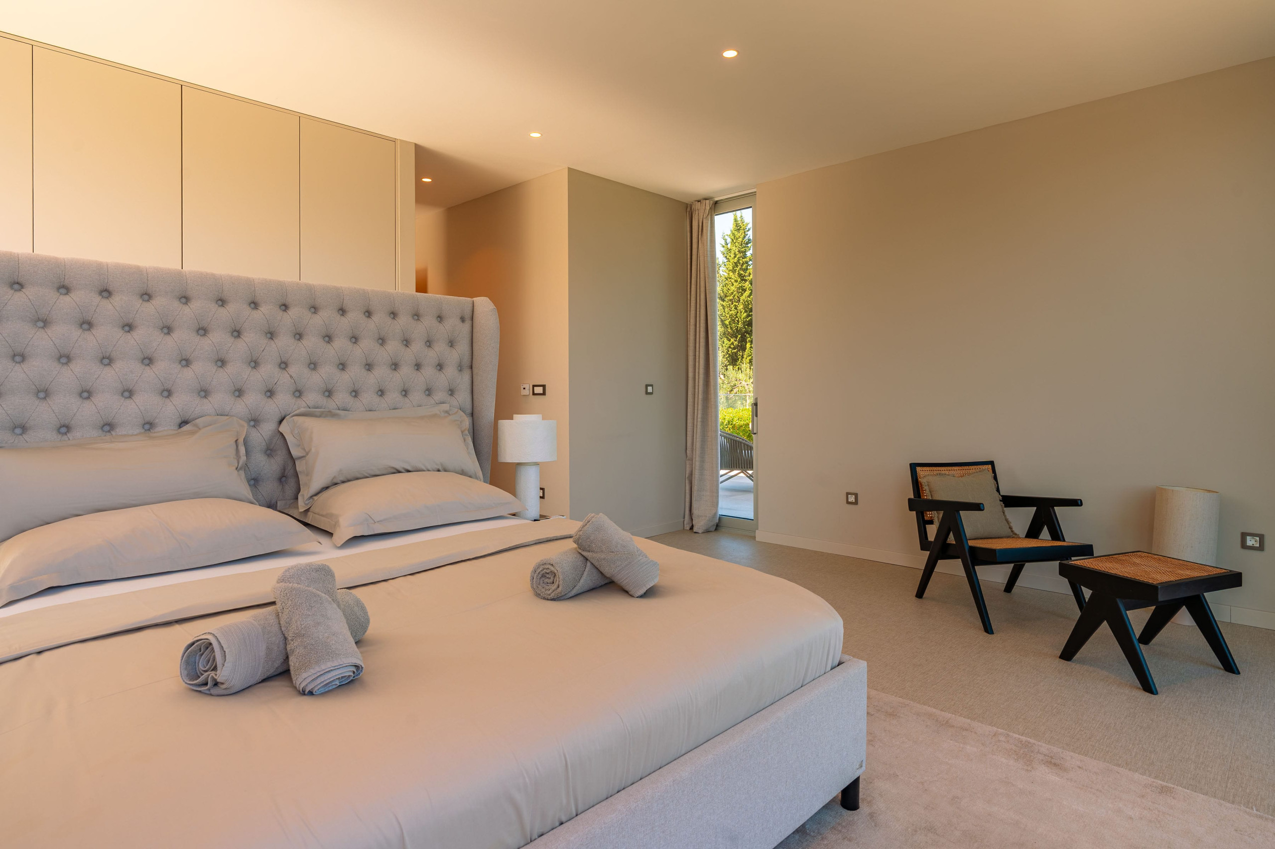 A luxurious master bedroom with an en-suite bathroom and a private terrace offering panoramic views of the sea and the surrounding landscape is located on the top floor of Villa Belmare 2.