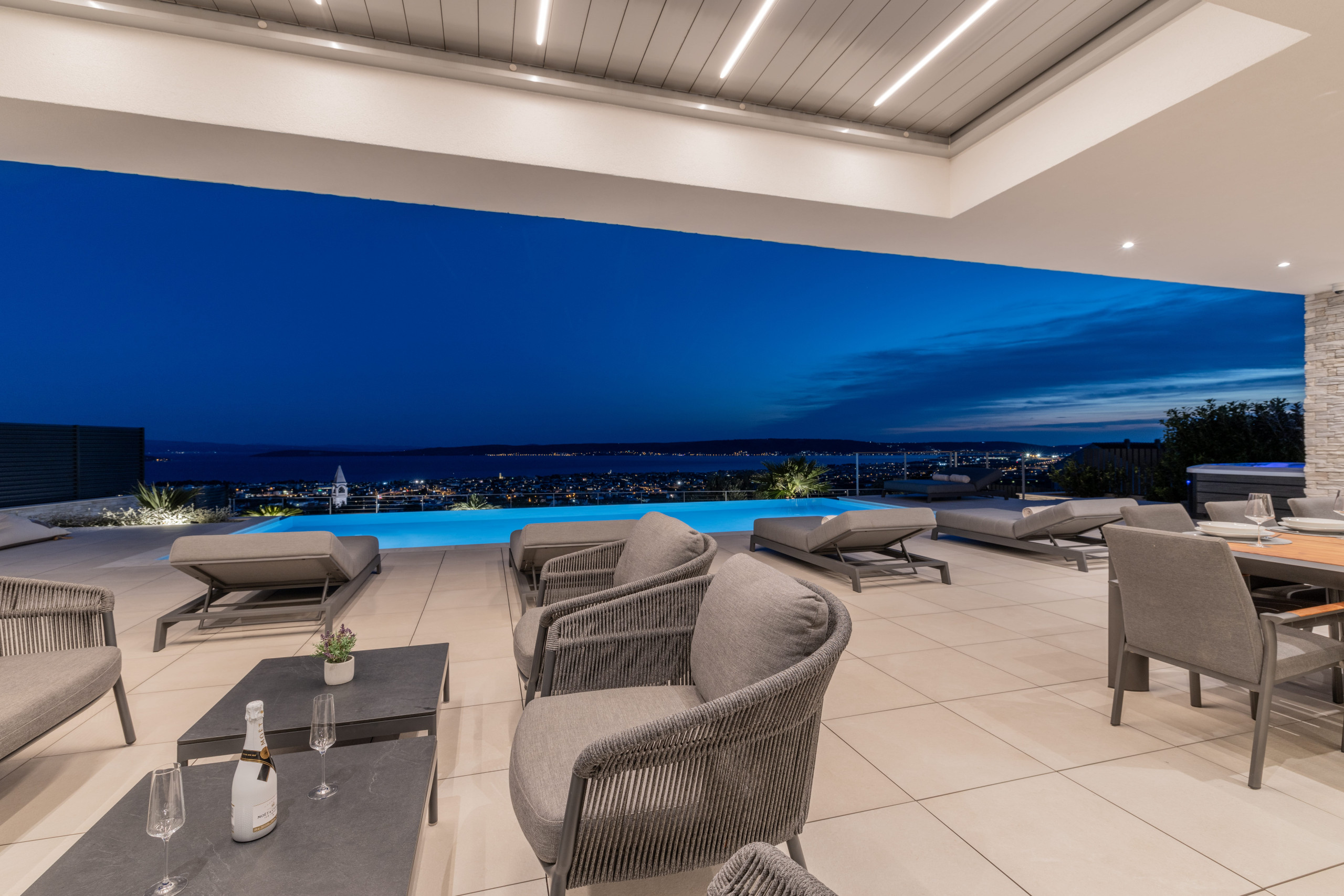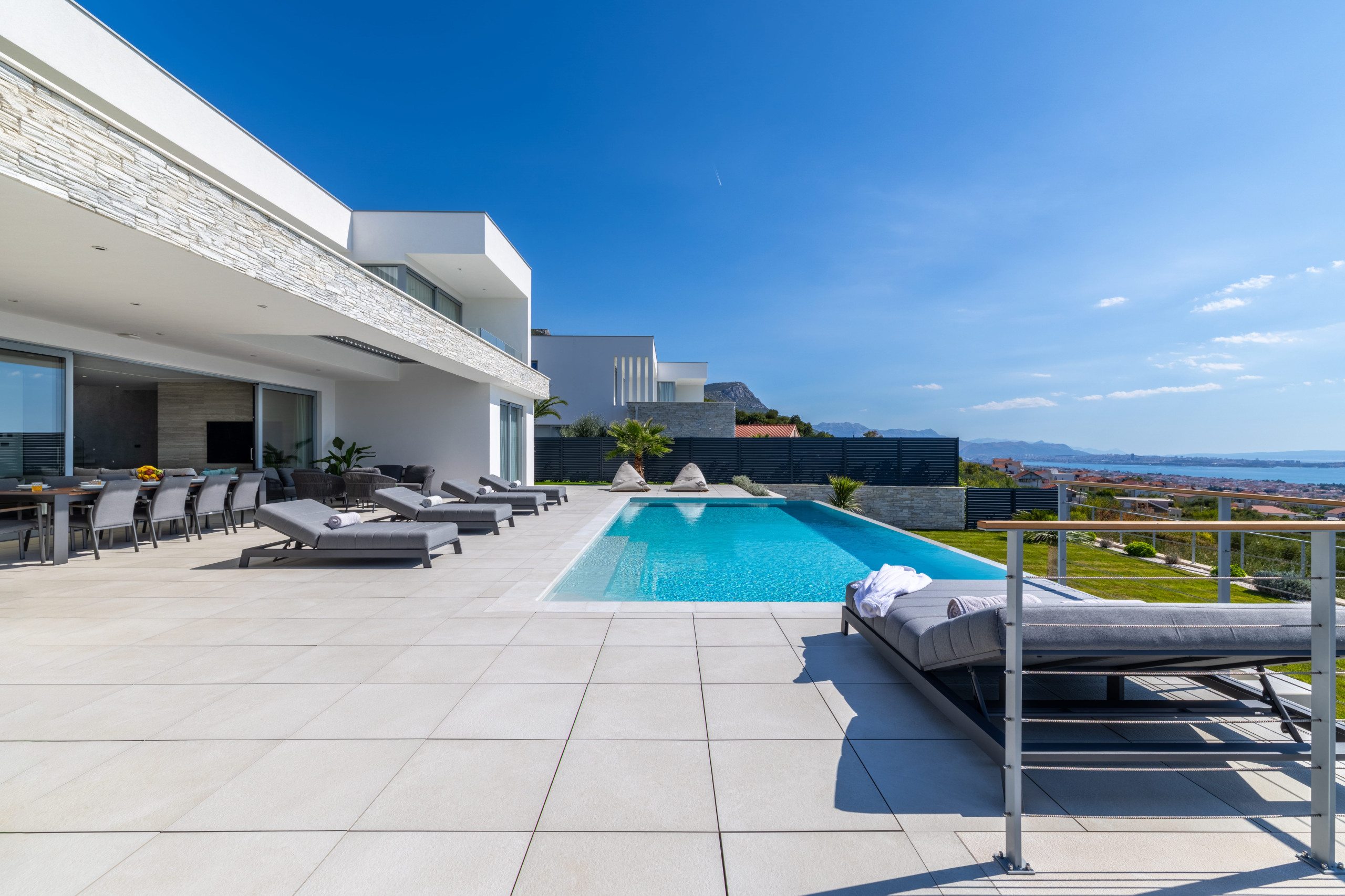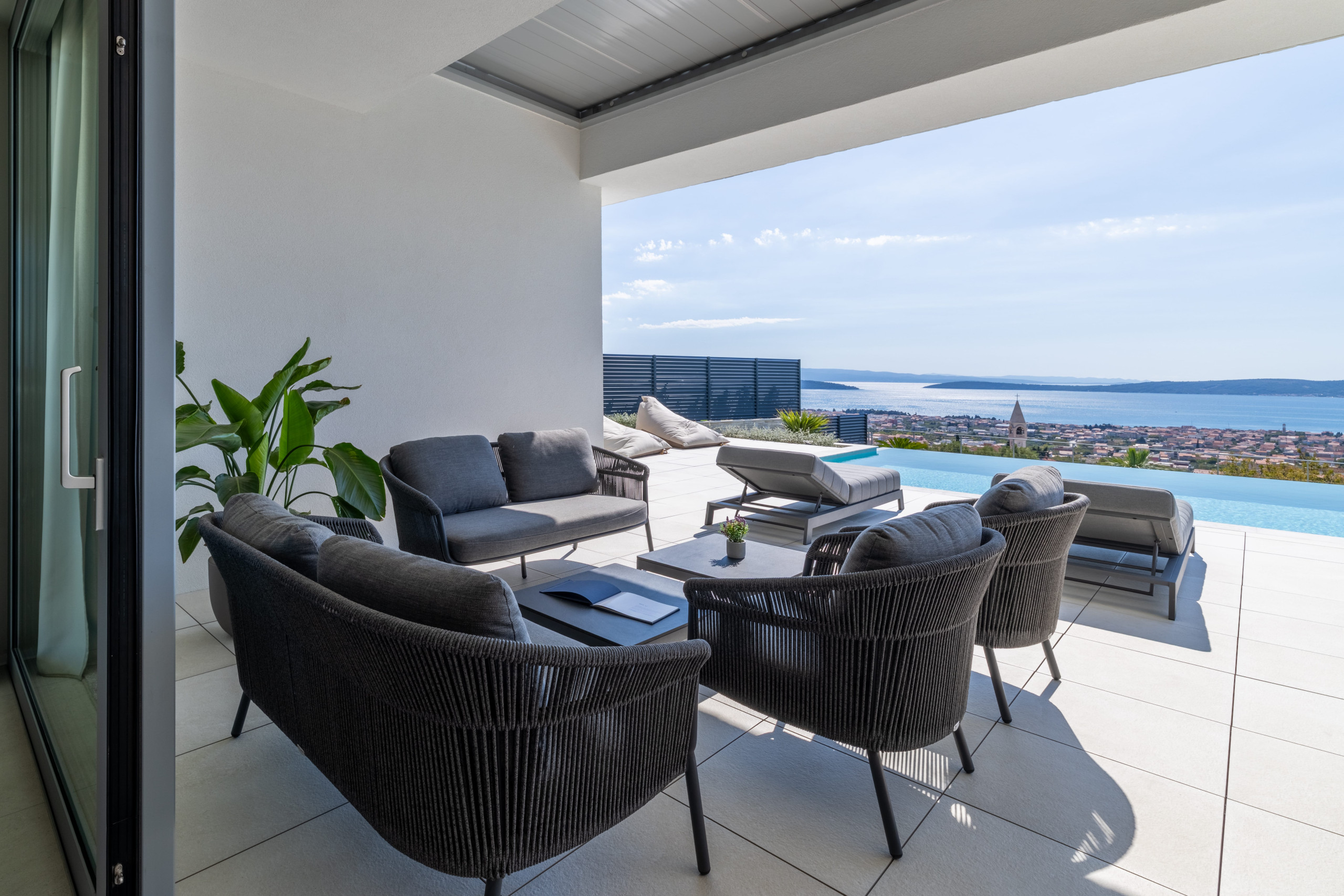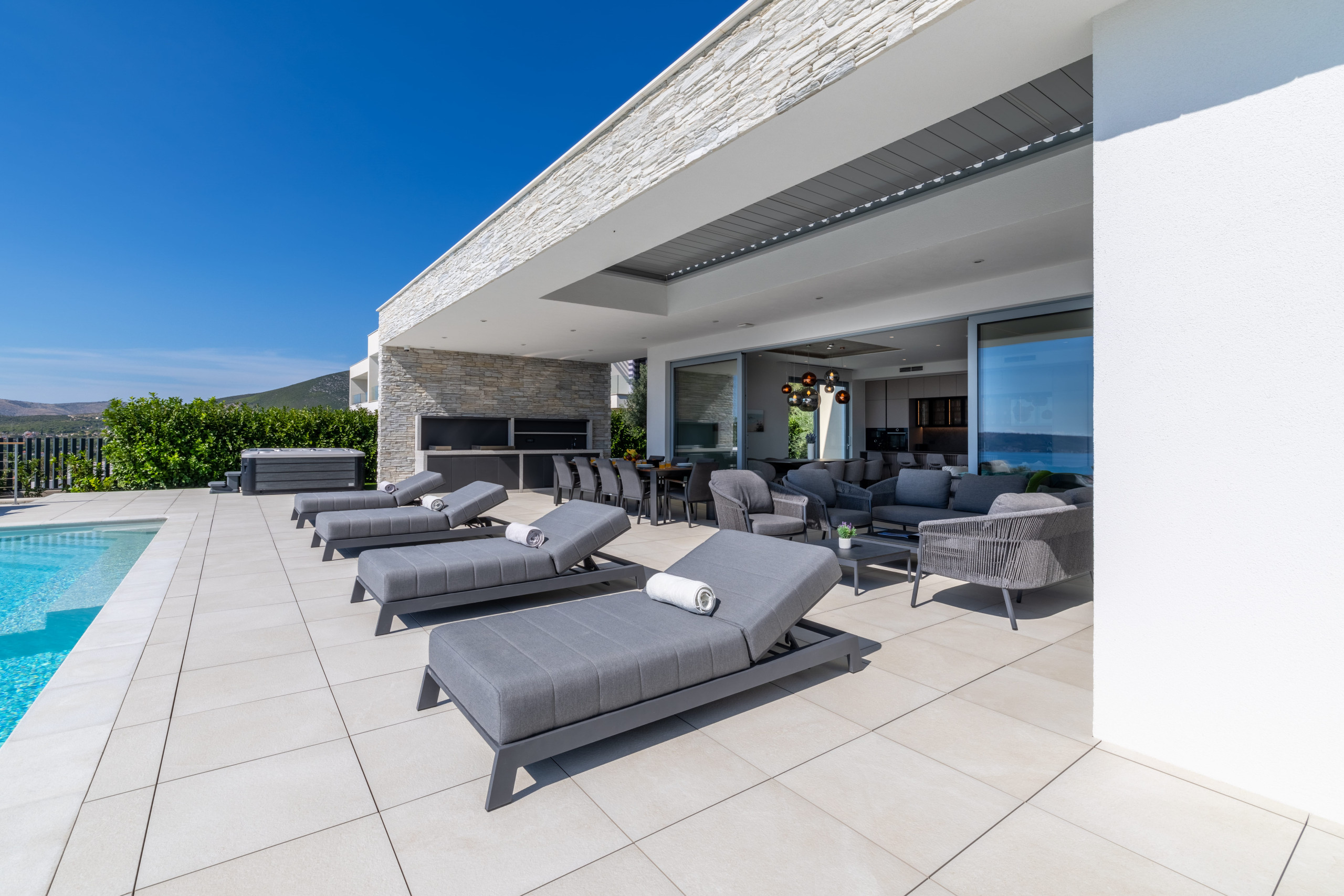 The interior of Villa Eternal Split is a modern open space with large floor-to-ceiling patio doors that can be fully opened to create a seamless indoor-outdoor flow. A sun-bathed terrace offers a Jacuzzi overlooking the coastline.