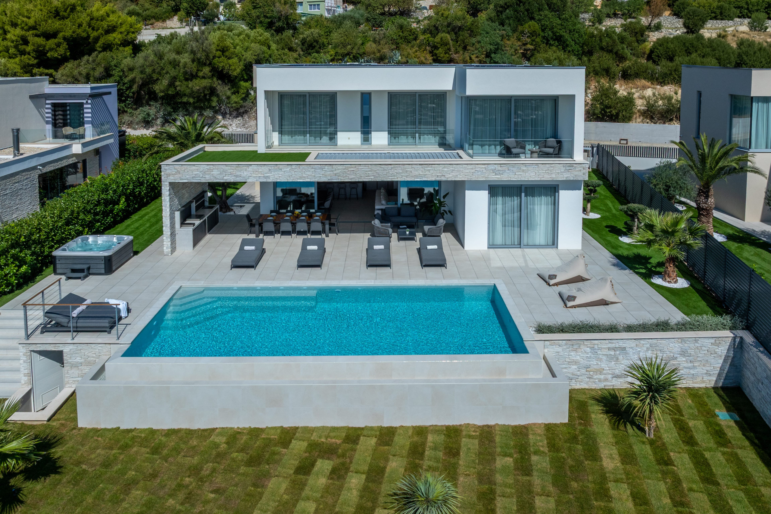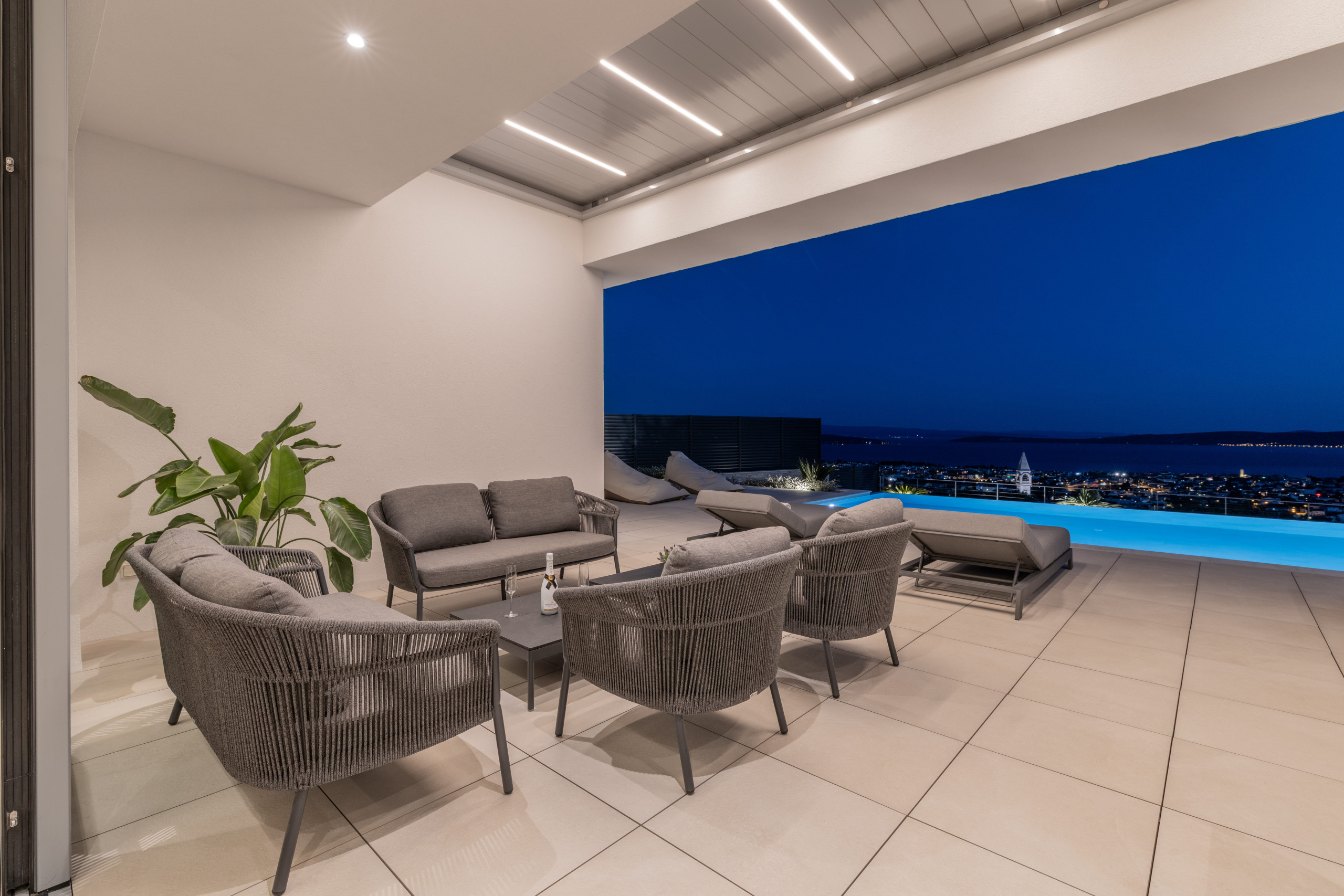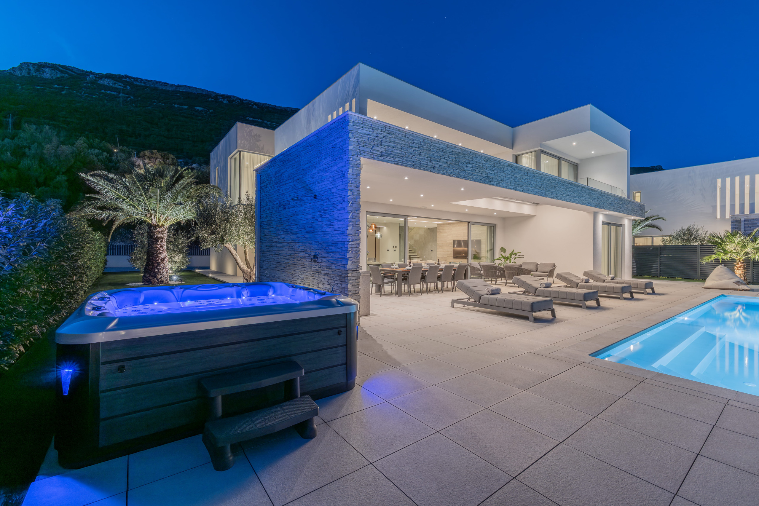 The interior of Villa Eternal Split is a modern open space with large floor-to-ceiling patio doors that can be fully opened to create a seamless indoor-outdoor flow. A sun-bathed terrace offers a Jacuzzi overlooking the coastline.