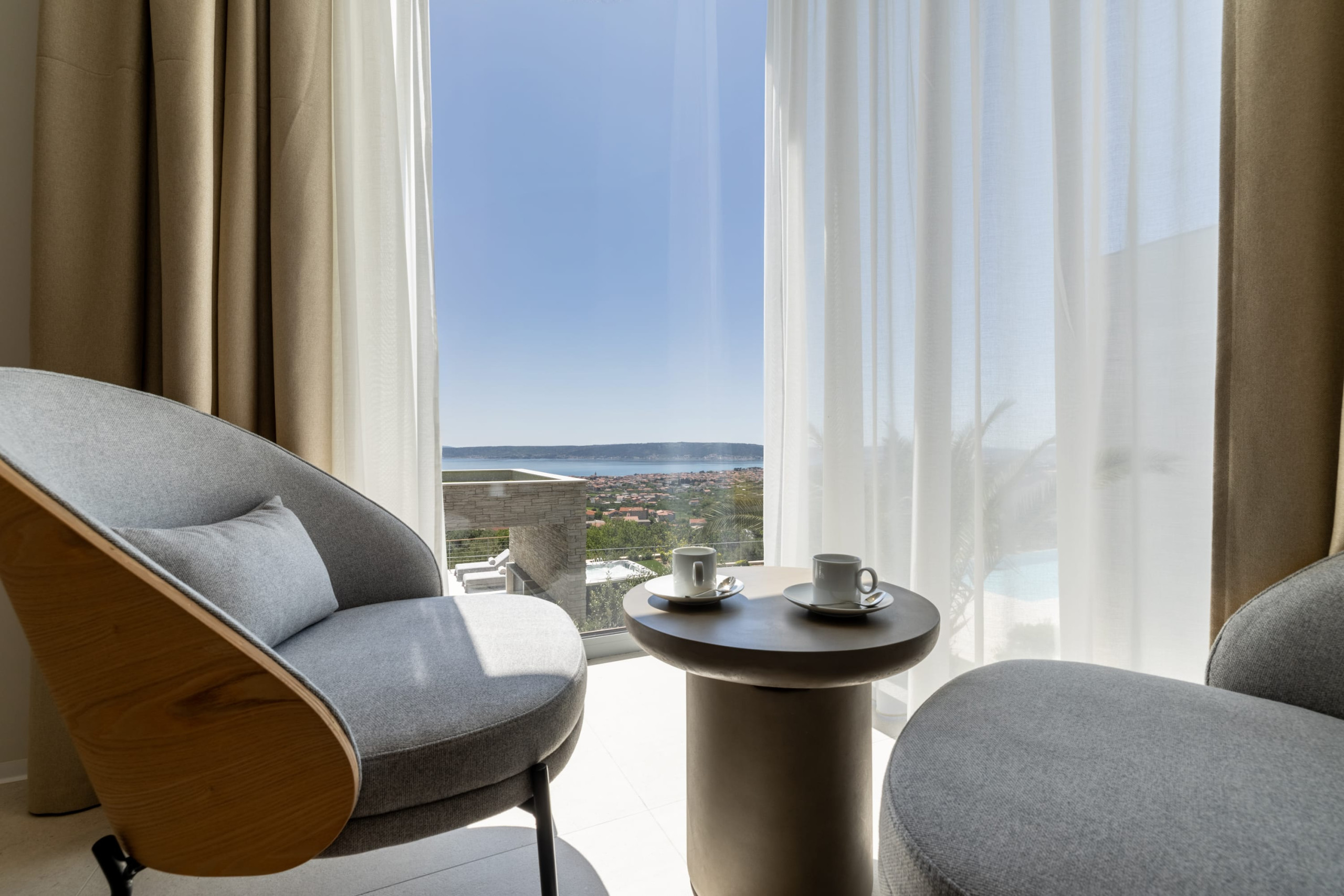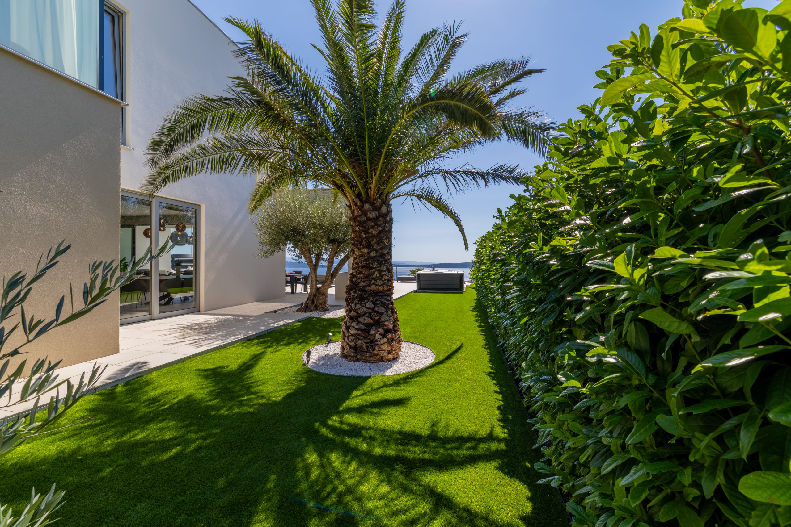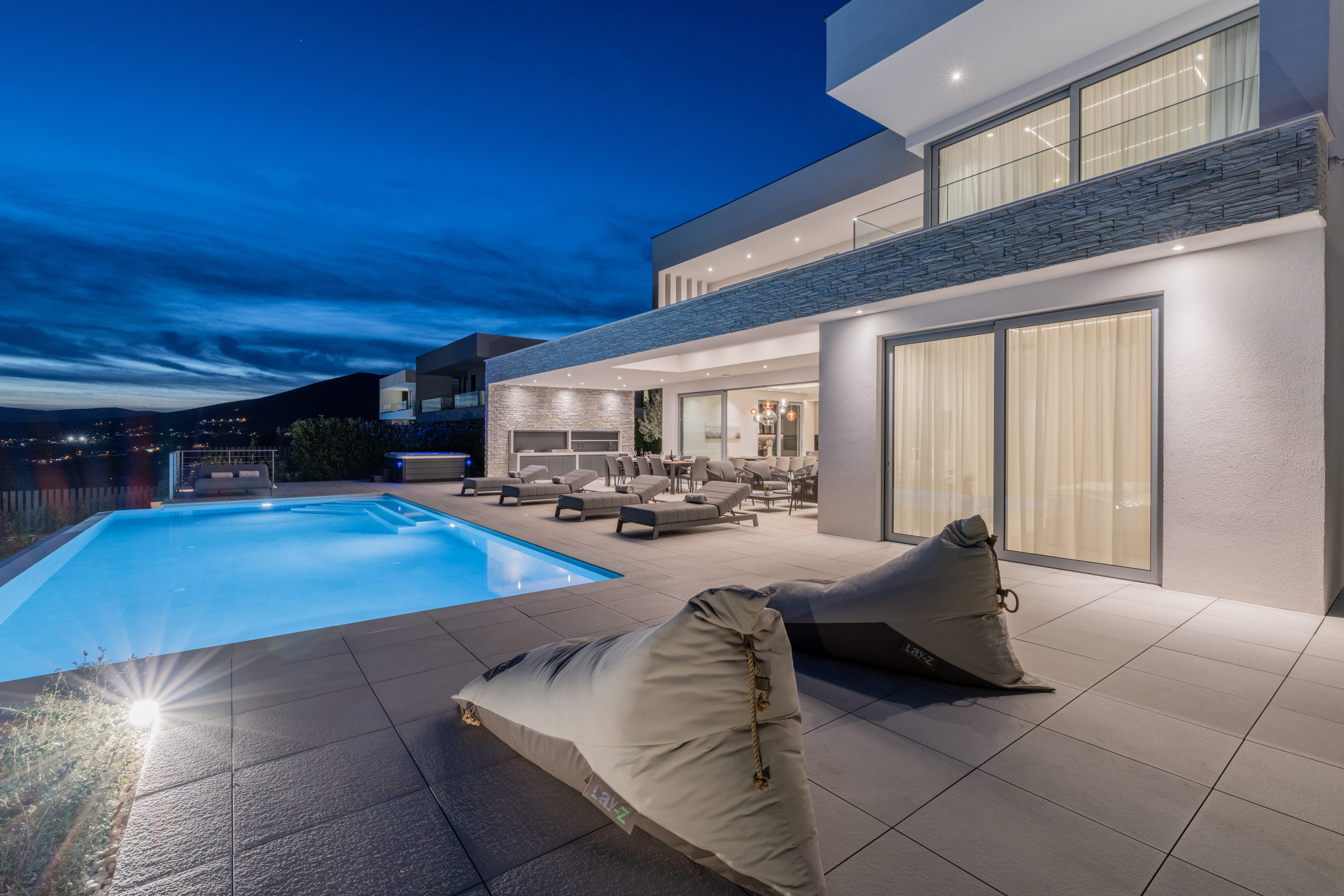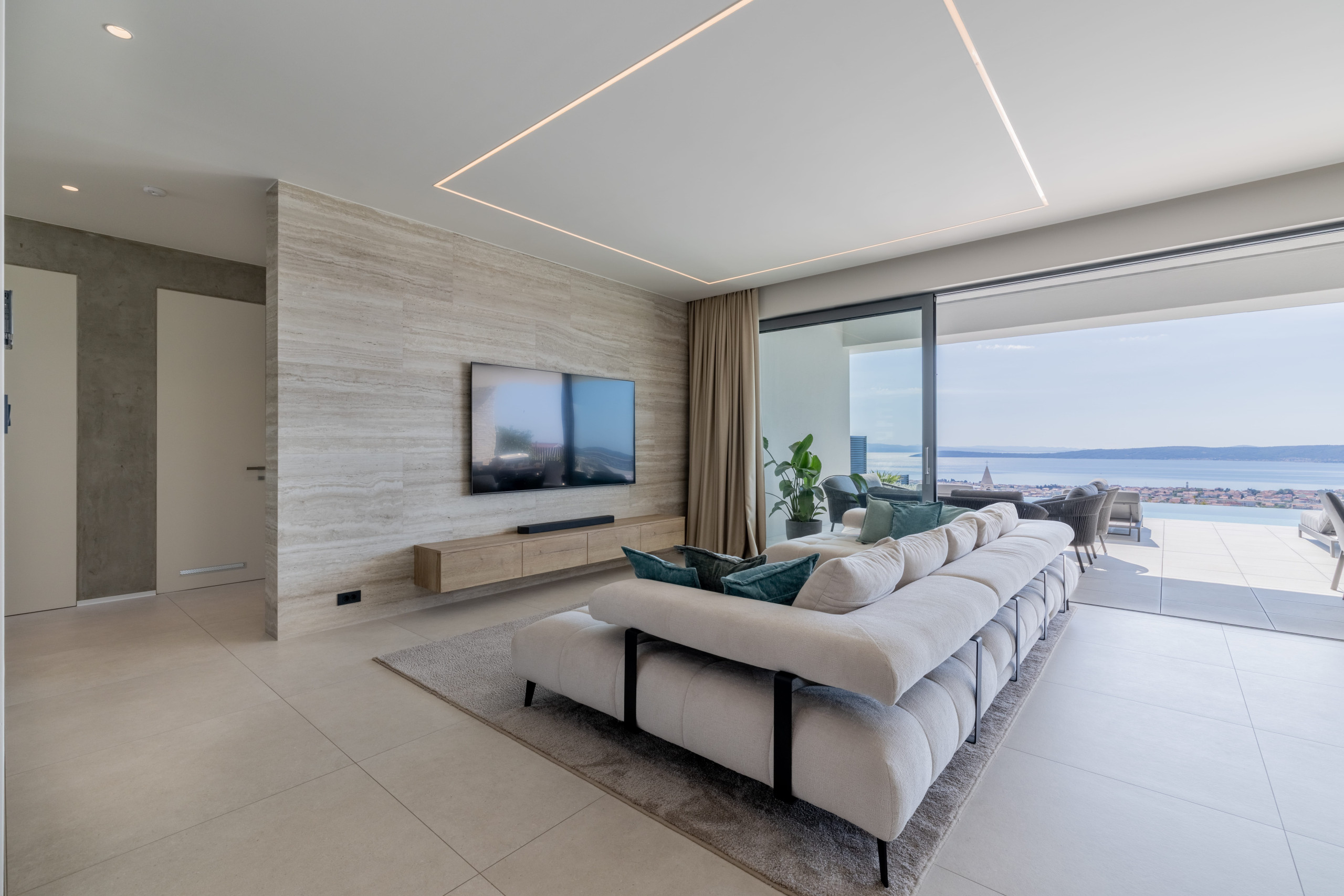 The interior of Villa Eternal Split is a modern open space with large floor-to-ceiling patio doors that can be fully opened to create a seamless indoor-outdoor flow. A sun-bathed terrace offers a Jacuzzi overlooking the coastline.