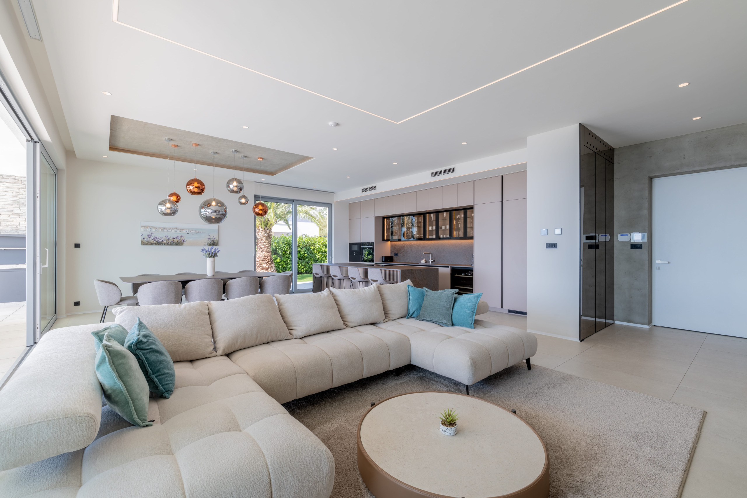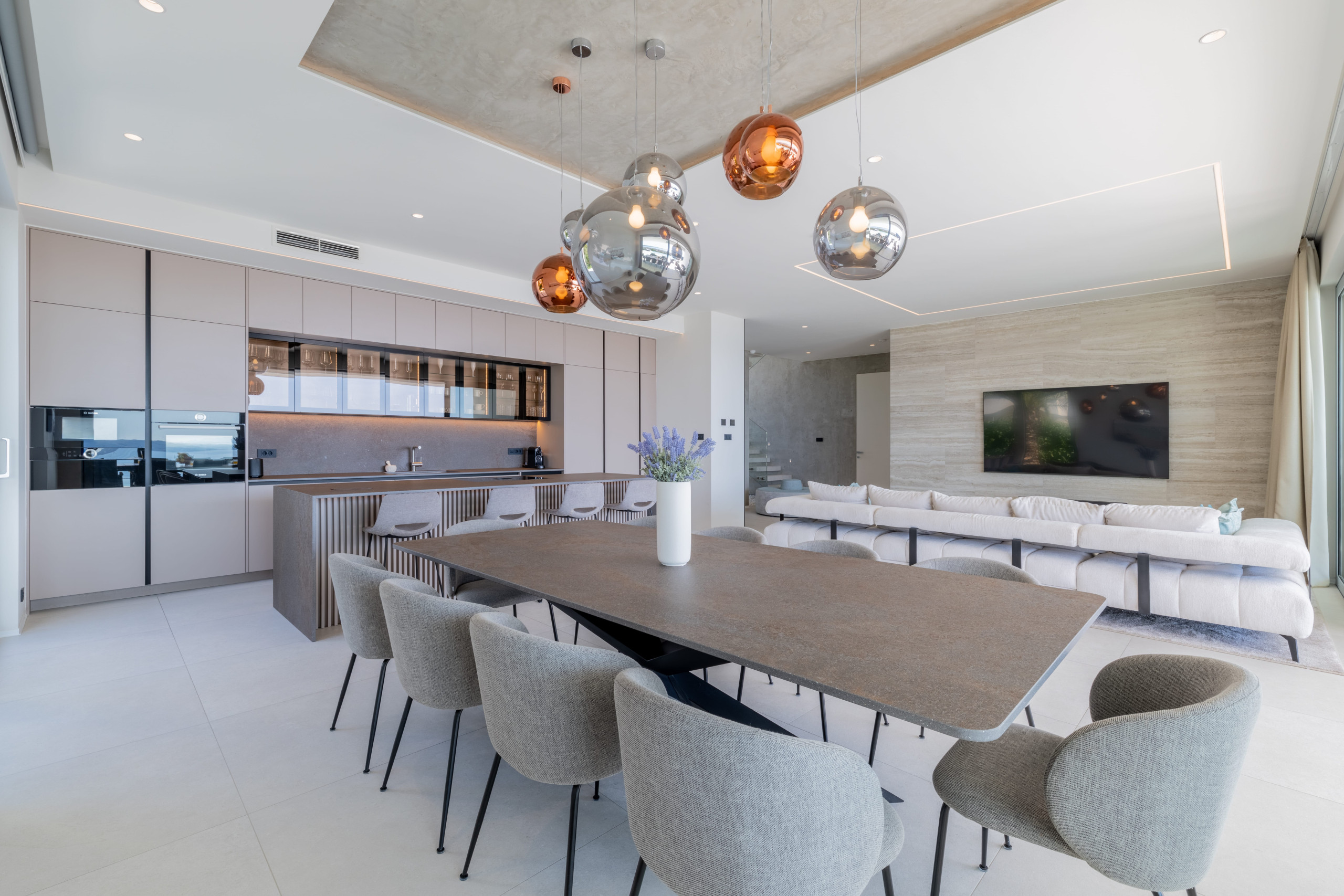 A contemporary kitchen with an island and an elegant dining space, along with a luxuriously designed lounge area in the living room, provides enjoyable moments indoors.