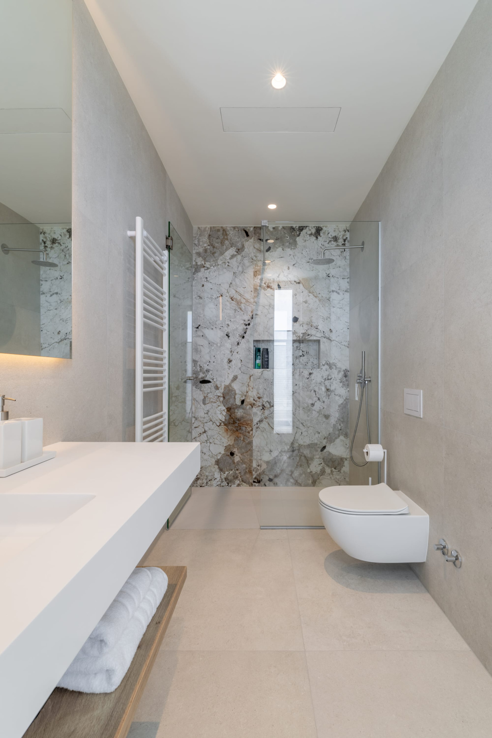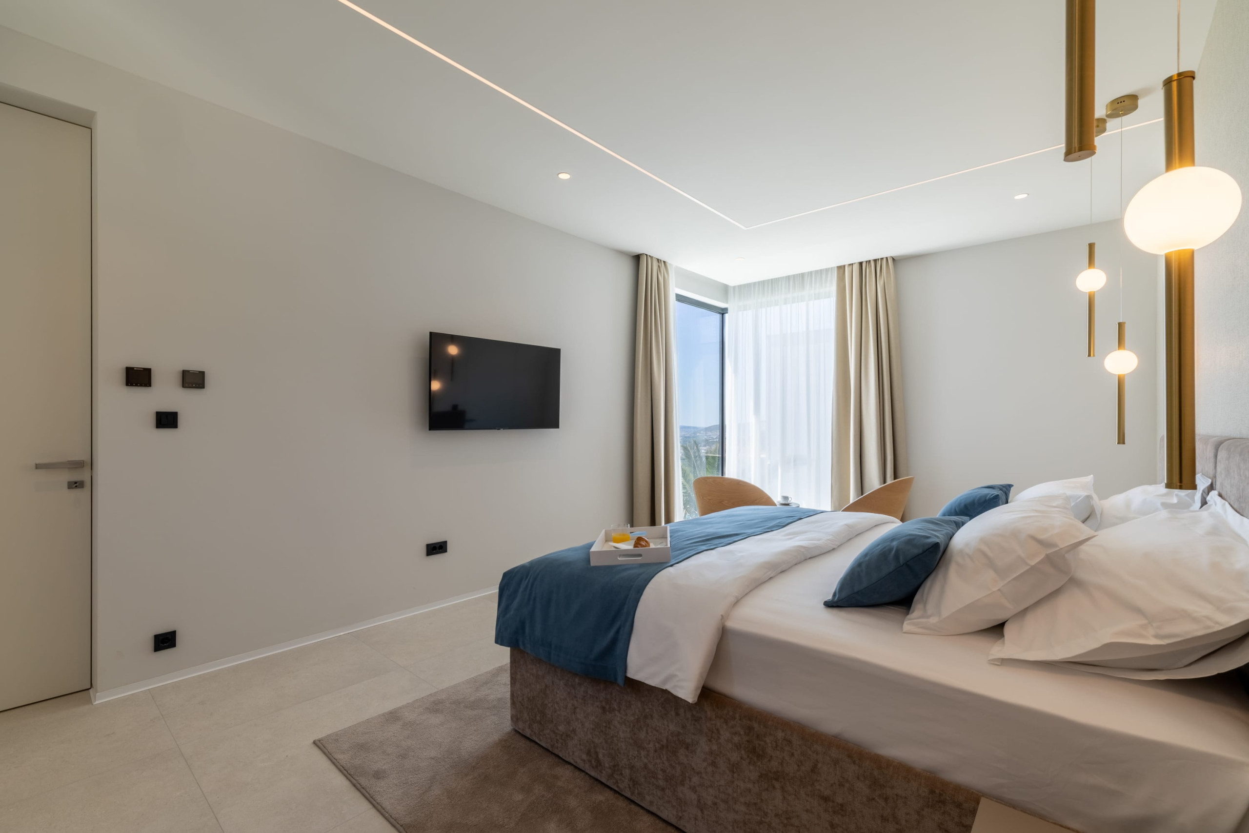 The villa can accommodate 10 guests in five beautifully designed bedrooms. All bedrooms feature an en-suite bathroom. One bedroom is located on the ground floor, where you can find a laundry room, a guest toilet, and a modernly equipped private gym.