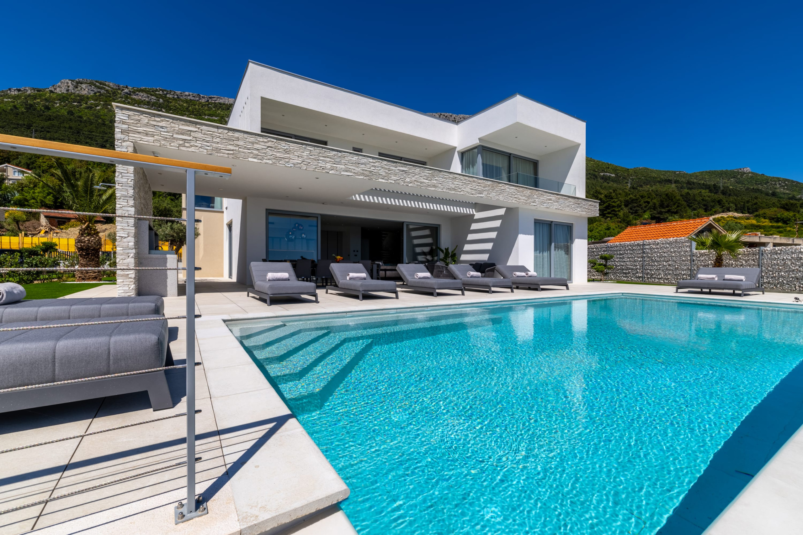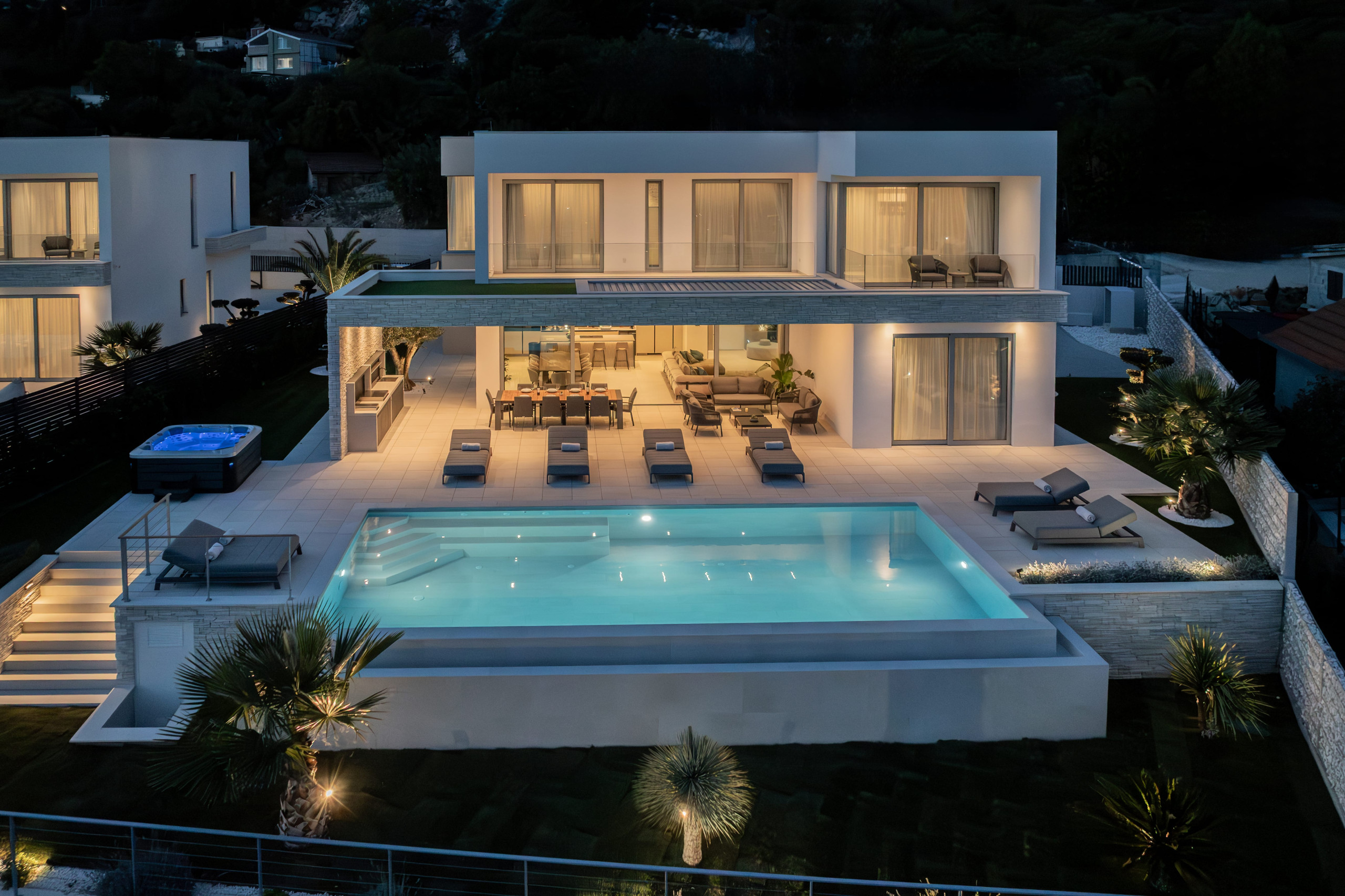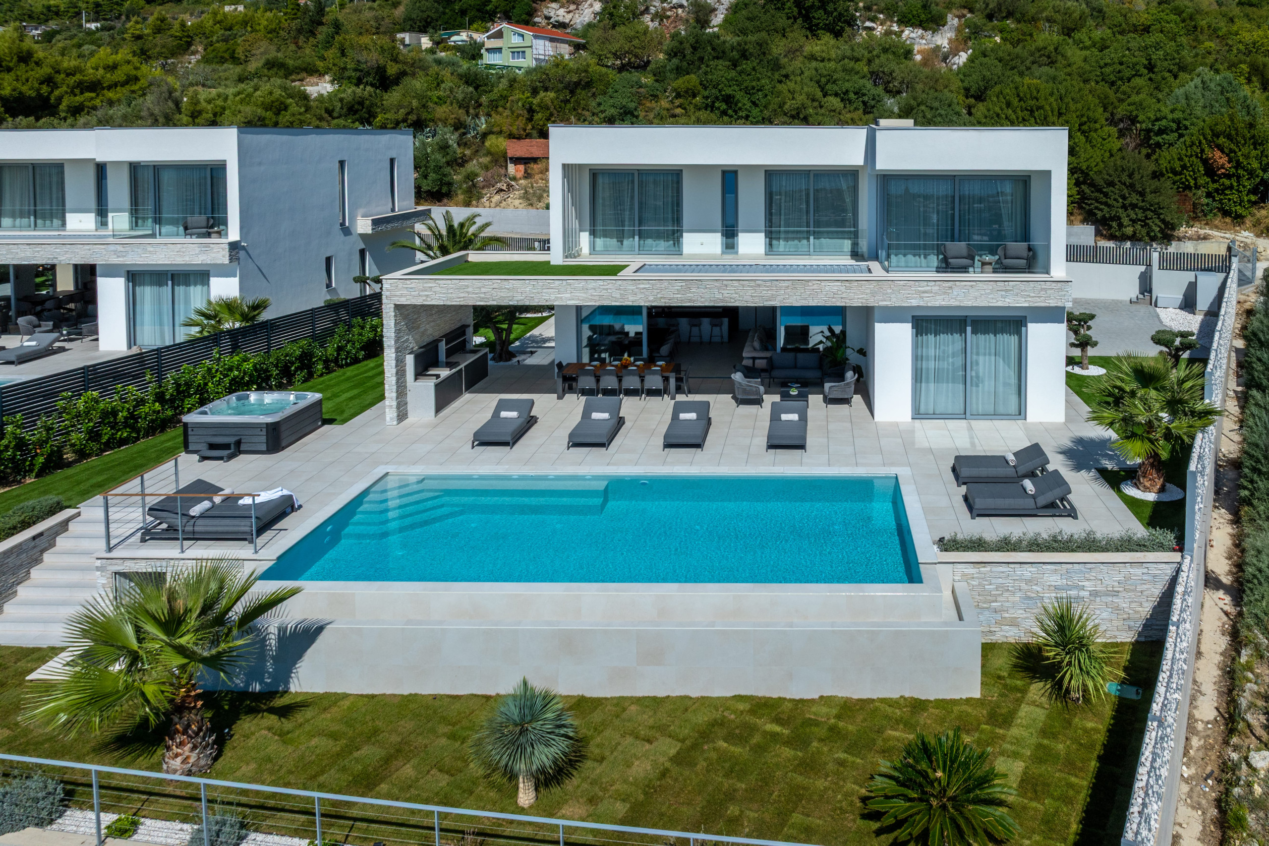 This newly built, and one of the best villas in Split, offers generous interior and exterior spaces, with plenty of room for all guests, whether you want privacy or a place to get together. Villa's outdoor area is designed for complete relaxation, featuring a stunning terrace with a heated infinity pool that opens up to the unforgettable views of the Adriatic Sea. Sun loungers next to the pool create a private oasis for sunbathing and unwinding. A jacuzzi, a fully equipped summer kitchen with a barbecue, and an al-fresco dining table make this area a perfect place to enjoy the evenings outdoors. A stylish lounge corner with a sofa and coffee table is ideal for slow mornings with a sea-view coffee or sunset cocktails.
