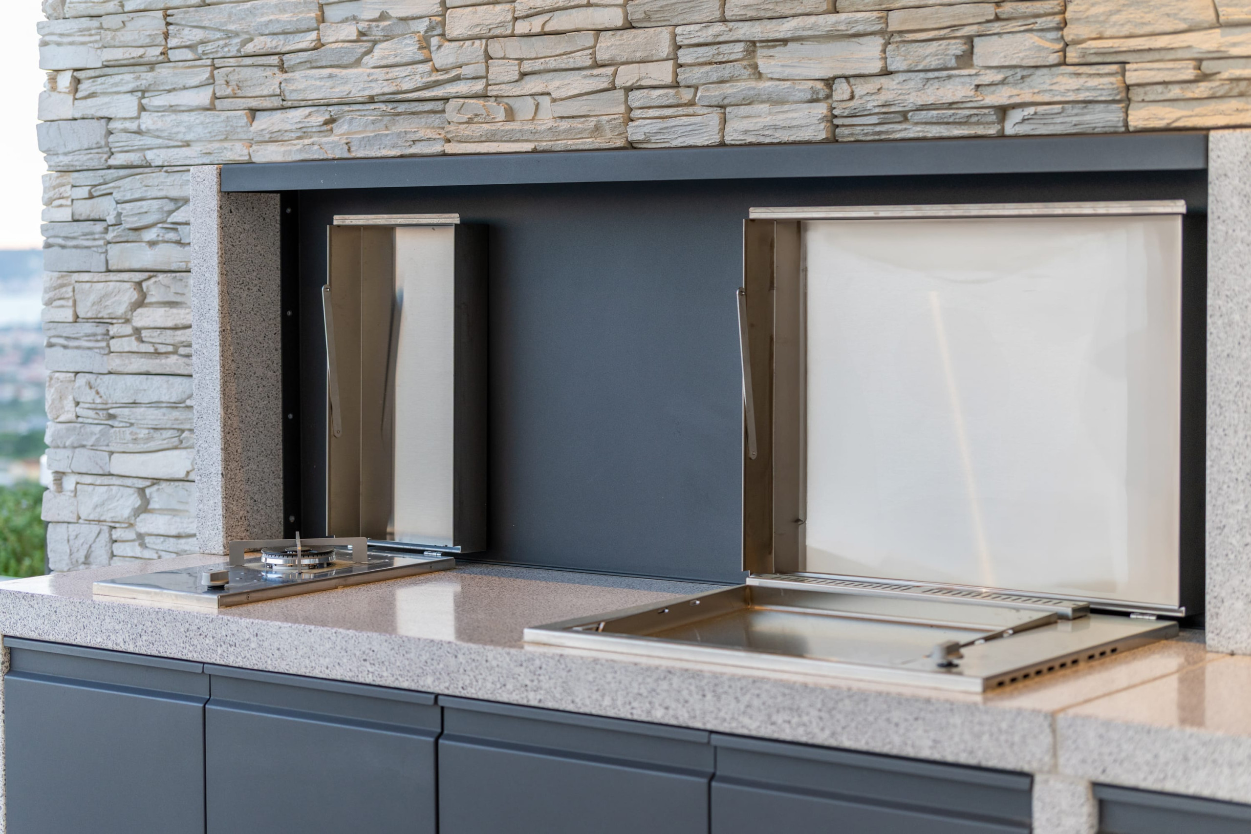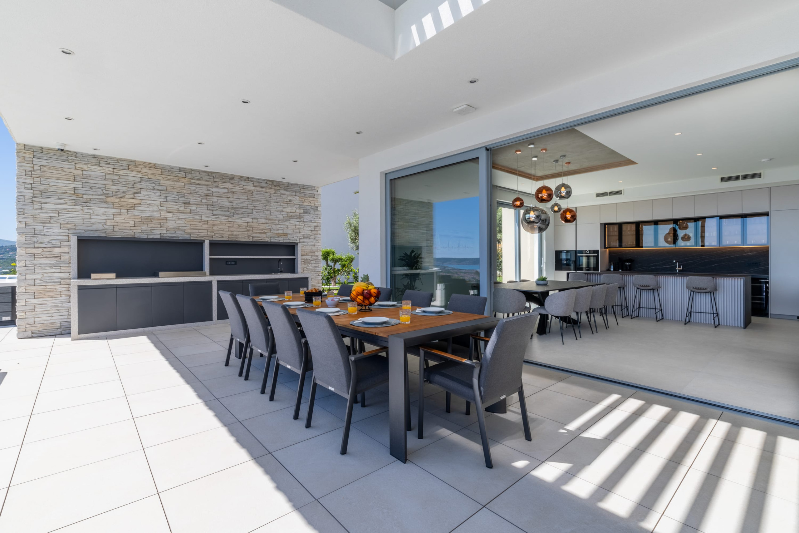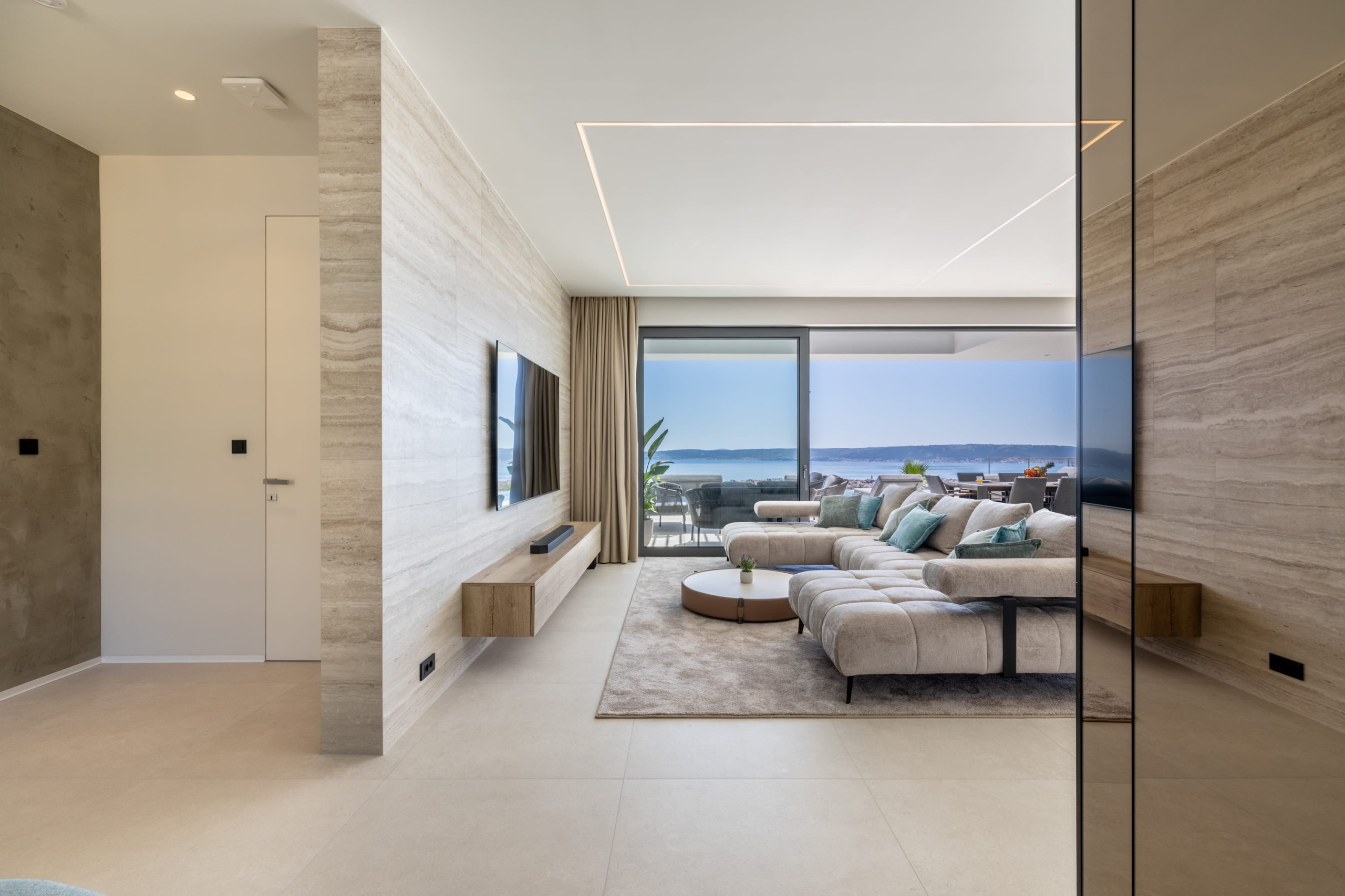 This newly built, and one of the best villas in Split, offers generous interior and exterior spaces, with plenty of room for all guests, whether you want privacy or a place to get together. Villa's outdoor area is designed for complete relaxation, featuring a stunning terrace with a heated infinity pool that opens up to the unforgettable views of the Adriatic Sea. Sun loungers next to the pool create a private oasis for sunbathing and unwinding. A jacuzzi, a fully equipped summer kitchen with a barbecue, and an al-fresco dining table make this area a perfect place to enjoy the evenings outdoors. A stylish lounge corner with a sofa and coffee table is ideal for slow mornings with a sea-view coffee or sunset cocktails.
