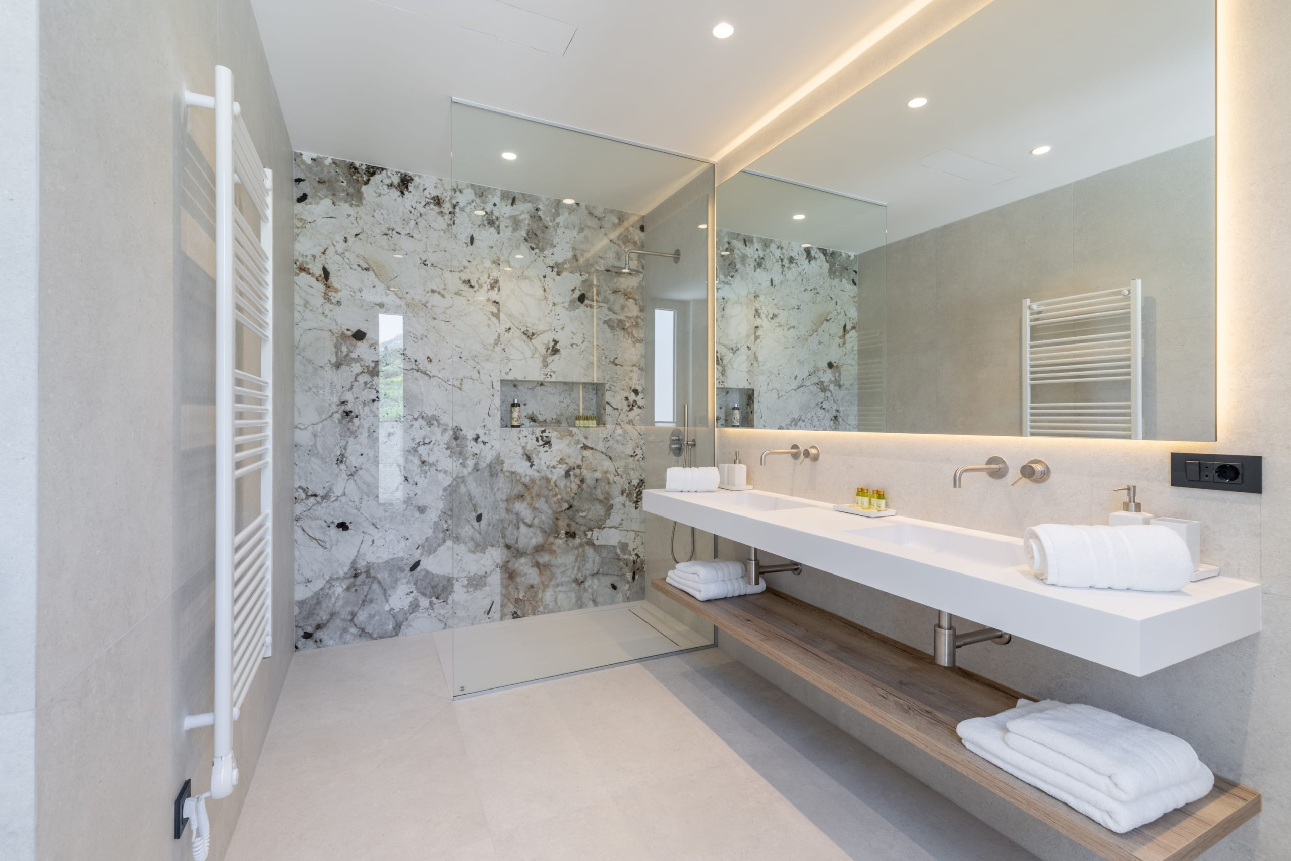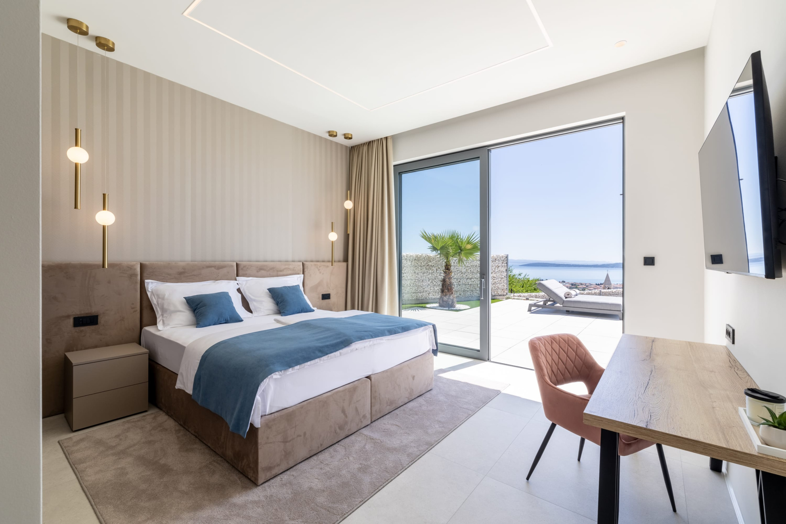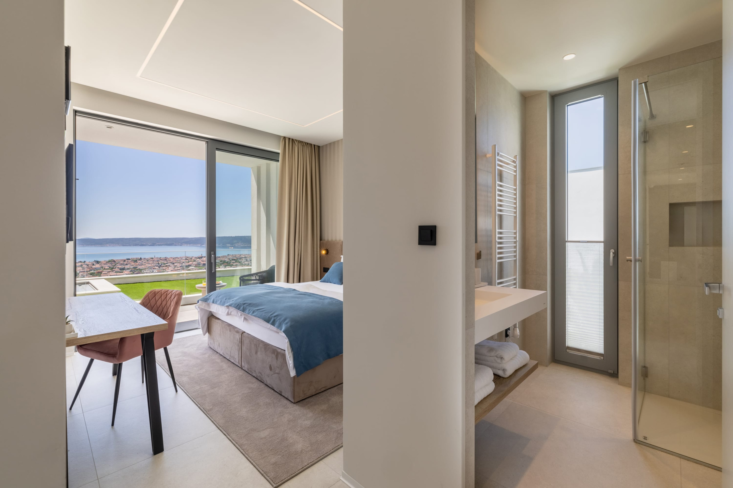 Villa Infinity Split features five bedrooms with king-size beds, private en-suite bathrooms, and fantastic sea views. All rooms are sunny and thoughtfully designed for comfort. Four bedrooms are on the first floor, while one is on the ground floor and provides direct access to the pool terrace. Villa Infinity Split comfortably accommodates 10 guests.