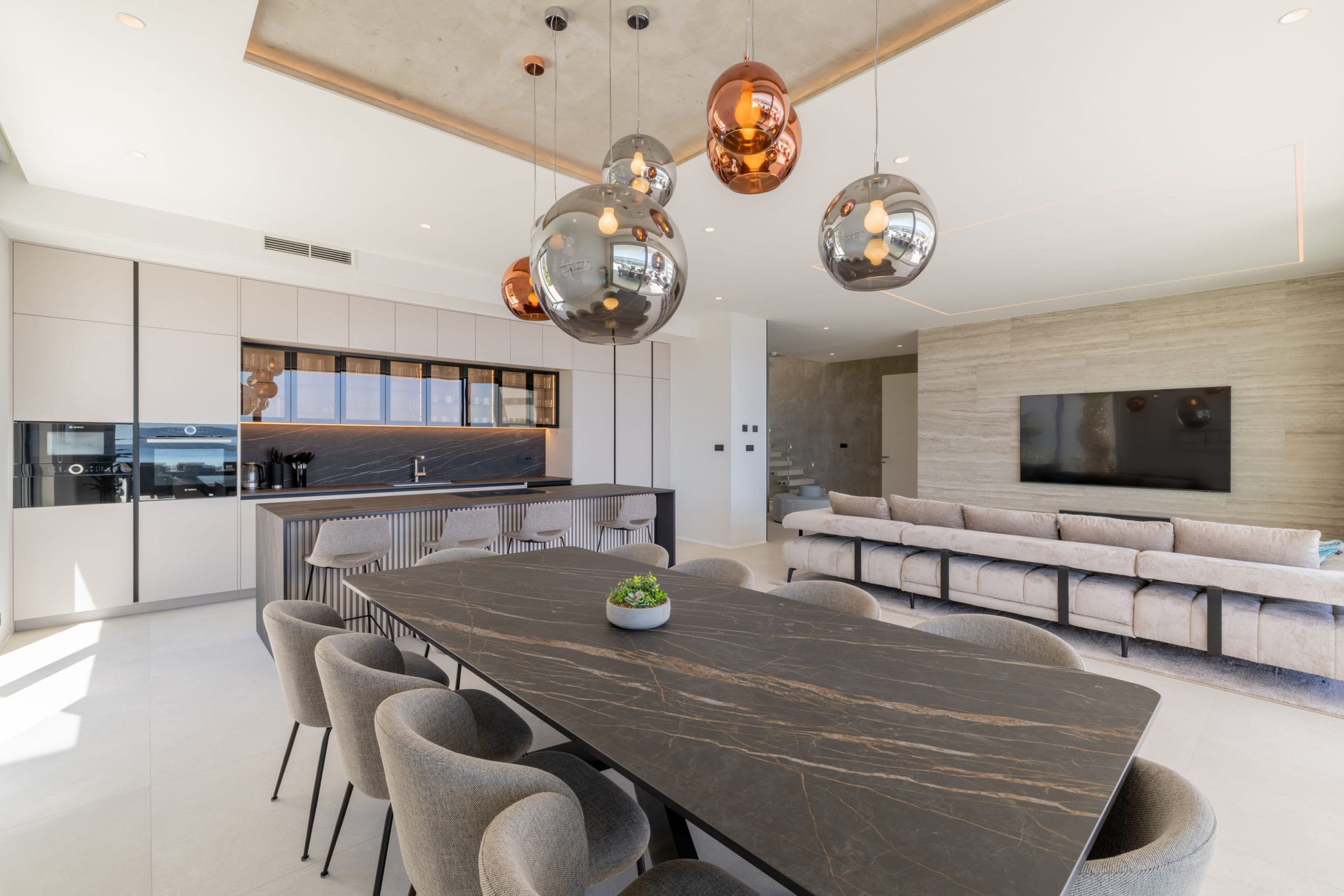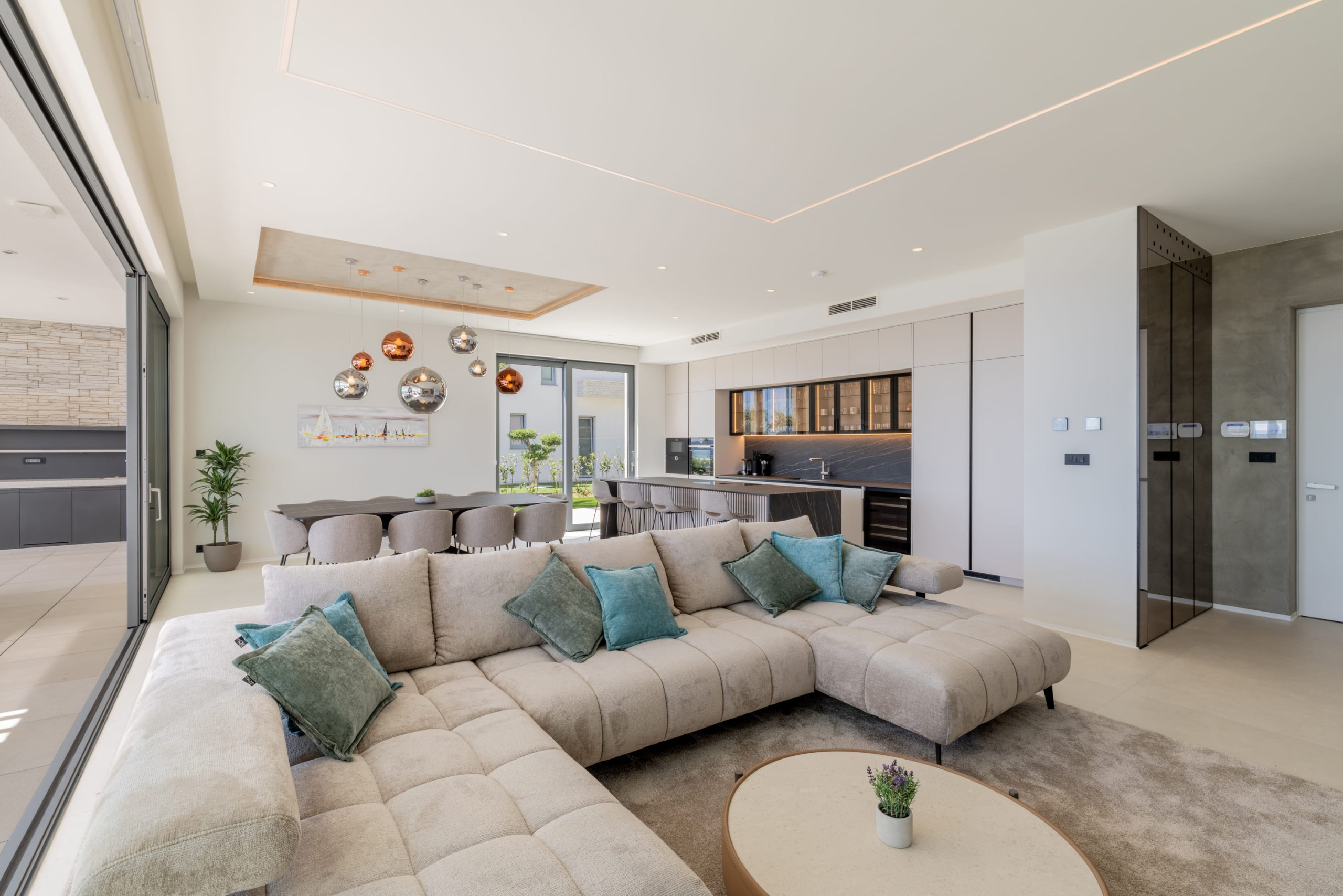 The villa's interior is inviting and sunny, with floor-to-ceiling glass doors that seamlessly connect the indoor space to the terrace. The spacious living room includes a large sofa and a smart TV, while the open-plan dining area and the modern, fully equipped kitchen with a central island offer everything you need for relaxed cooking and entertaining.