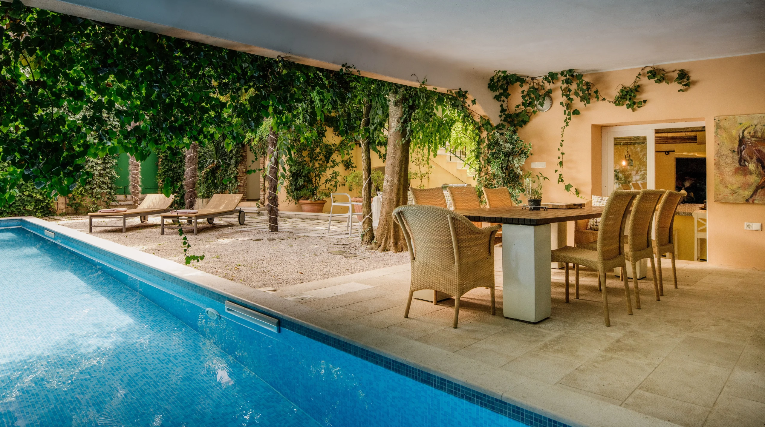Villa Jelsa Palace is situated in the town center of Jelsa. This picturesque village, with beautiful beaches and vibrant nightlife, offers numerous vineyards, olive groves, and cultural sights. The island of Hvar is the island with the most hours of sunshine in Europe, which makes it an ideal vacation destination. This magnificent villa is surrounded by high stone walls, which ensure complete privacy. The plot area extends over 600 square meters and has a beautiful garden, greenery, and palm trees. A long swimming pool is set along the entire wall so you can fully relax and unwind. There is a spacious terrace with a gas barbecue and an outdoor dining area, perfect for gatherings and dining in the fresh air.