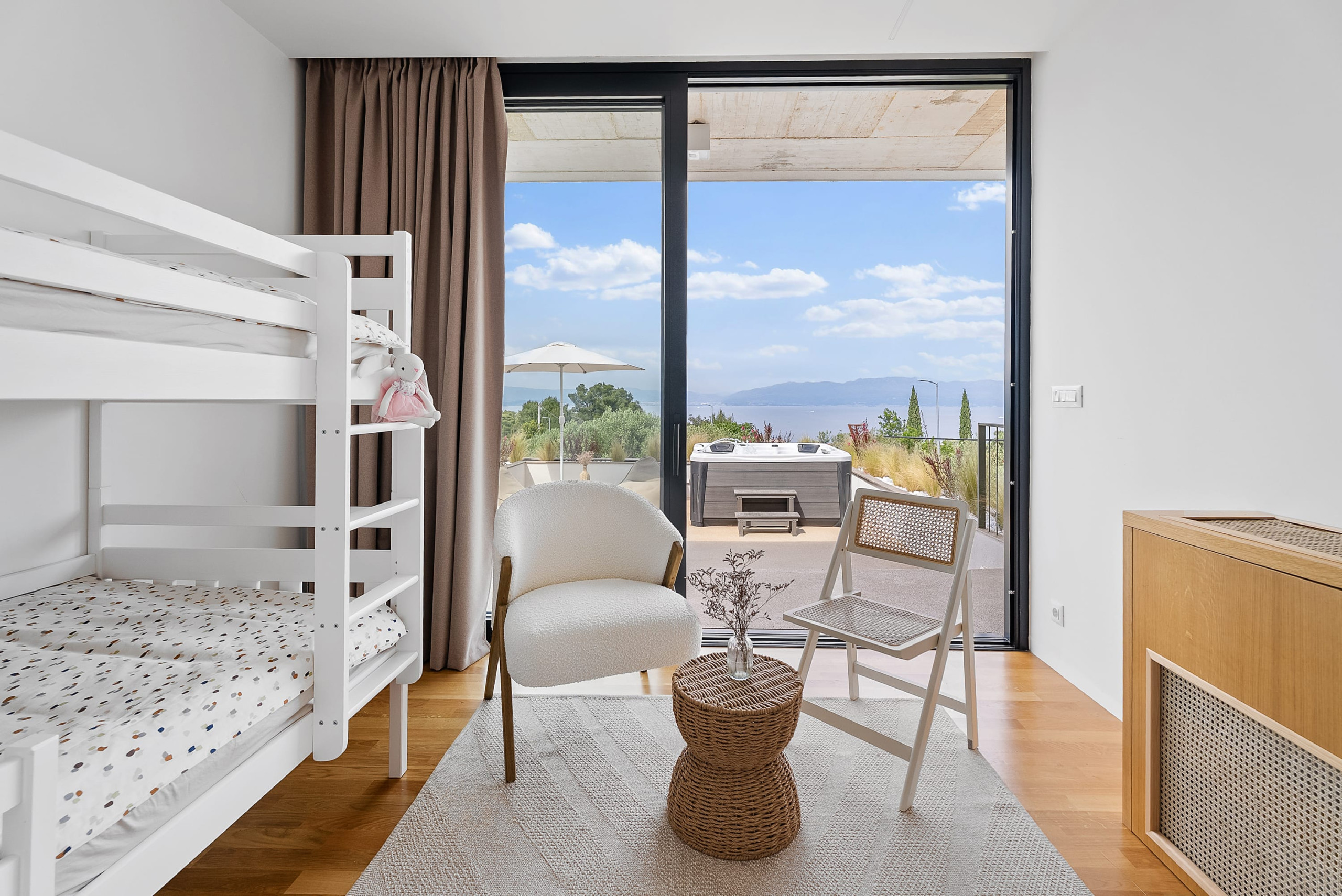 Villa Olea features spacious indoor and outdoor living spaces thoughtfully designed for comfort and relaxation. It also features modern amenities such as a Frame TV with Netflix, air conditioning, and a sound system. Indulge in culinary delights in the fully equipped kitchen and elegant dining room, or unwind in the spacious, sea-view bedrooms with en-suite bathrooms. The villa can accommodate up to 8 guests in four bedrooms. Three bedrooms feature a double bed, and the fourth bedroom is designated as a children's room with bunk beds.