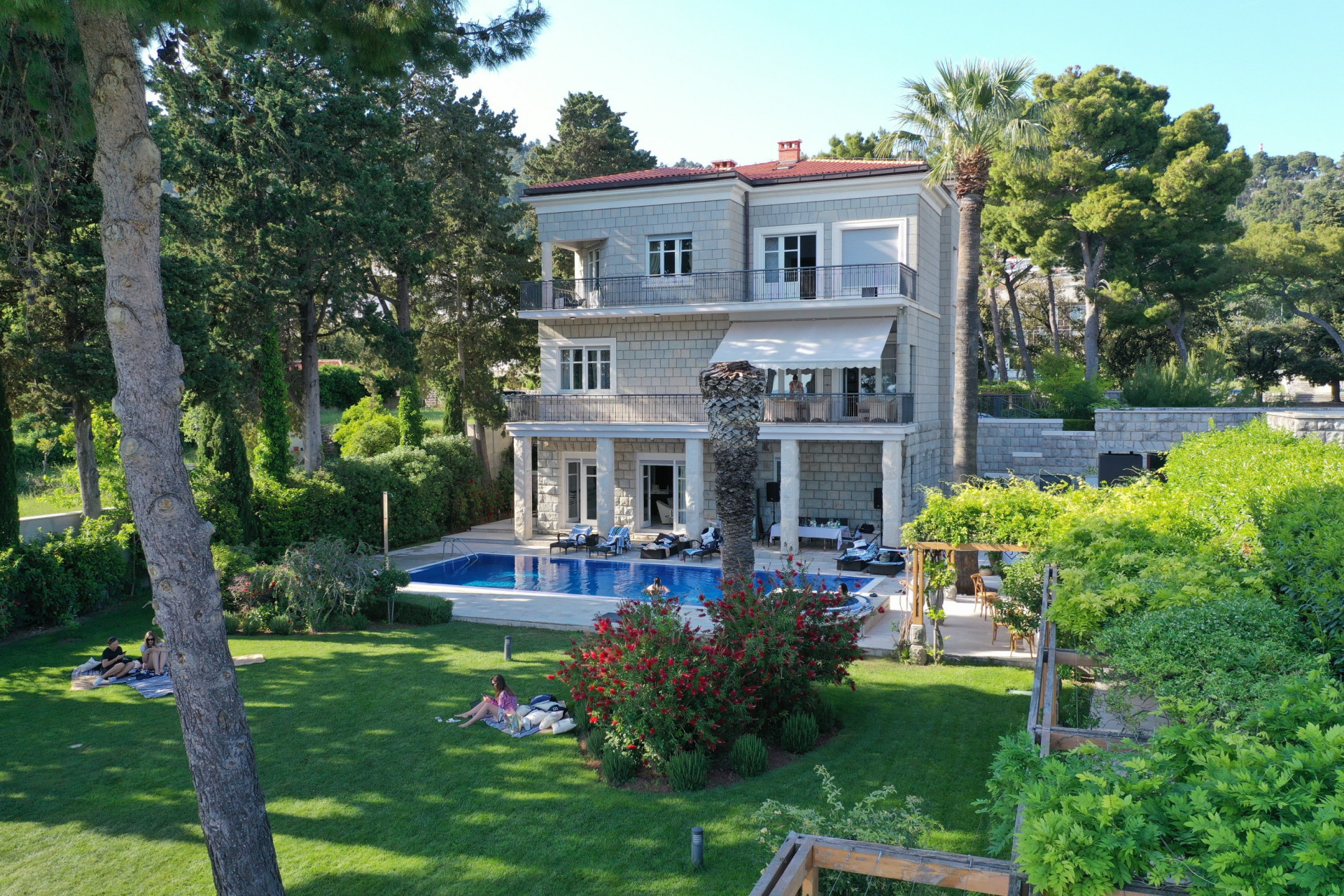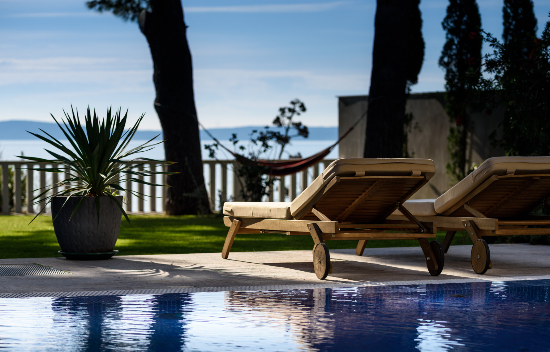 Villa Prestige Split is set on a plot of just over 1000 m² of land, and it is ideal for recharging your batteries and soaking up the incredible scenery. A large swimming pool measuring 12 x 6 meters, with a Jacuzzi, is perfectly positioned for guests to enjoy the amazing sea view, enhanced by two large palm trees and abundant Mediterranean plants and greenery.