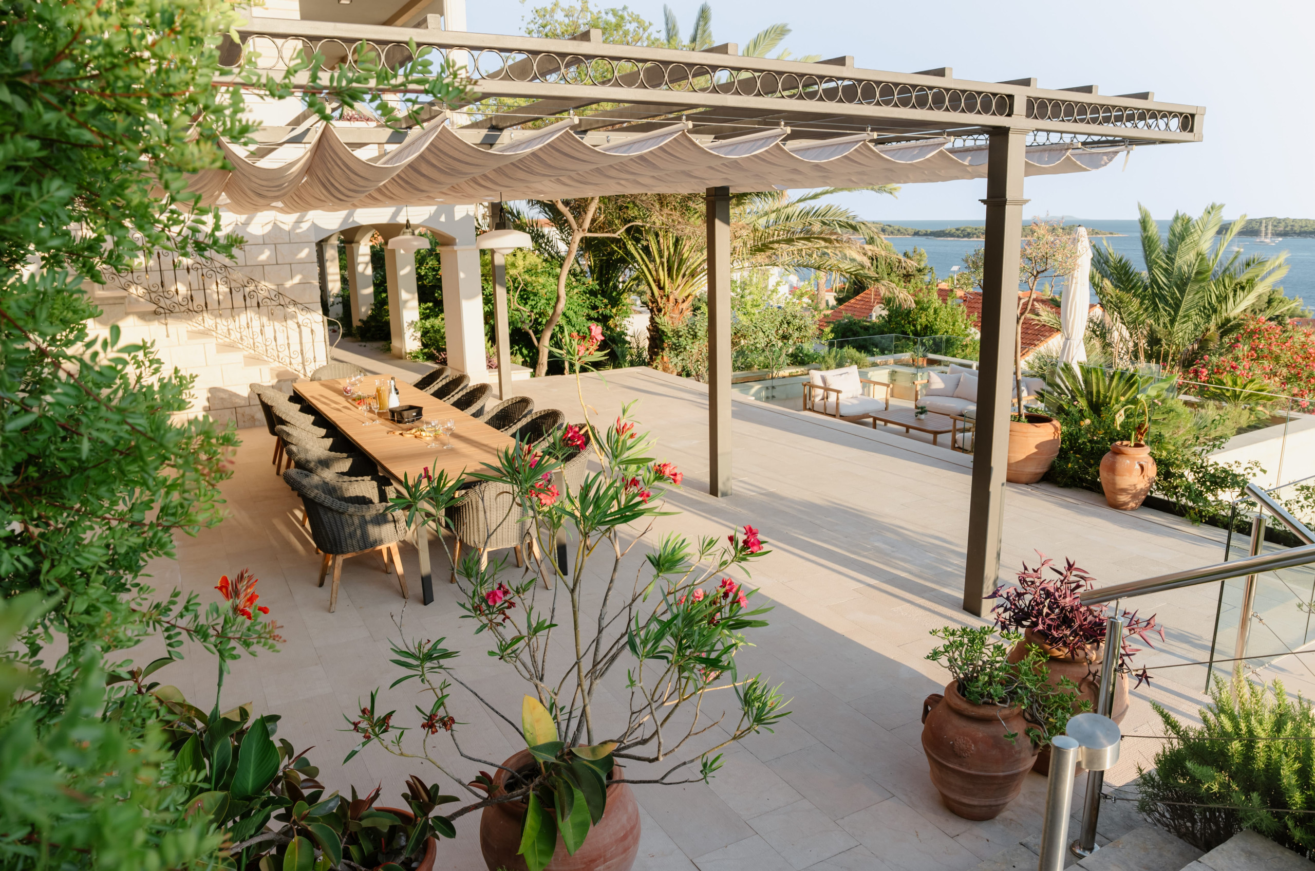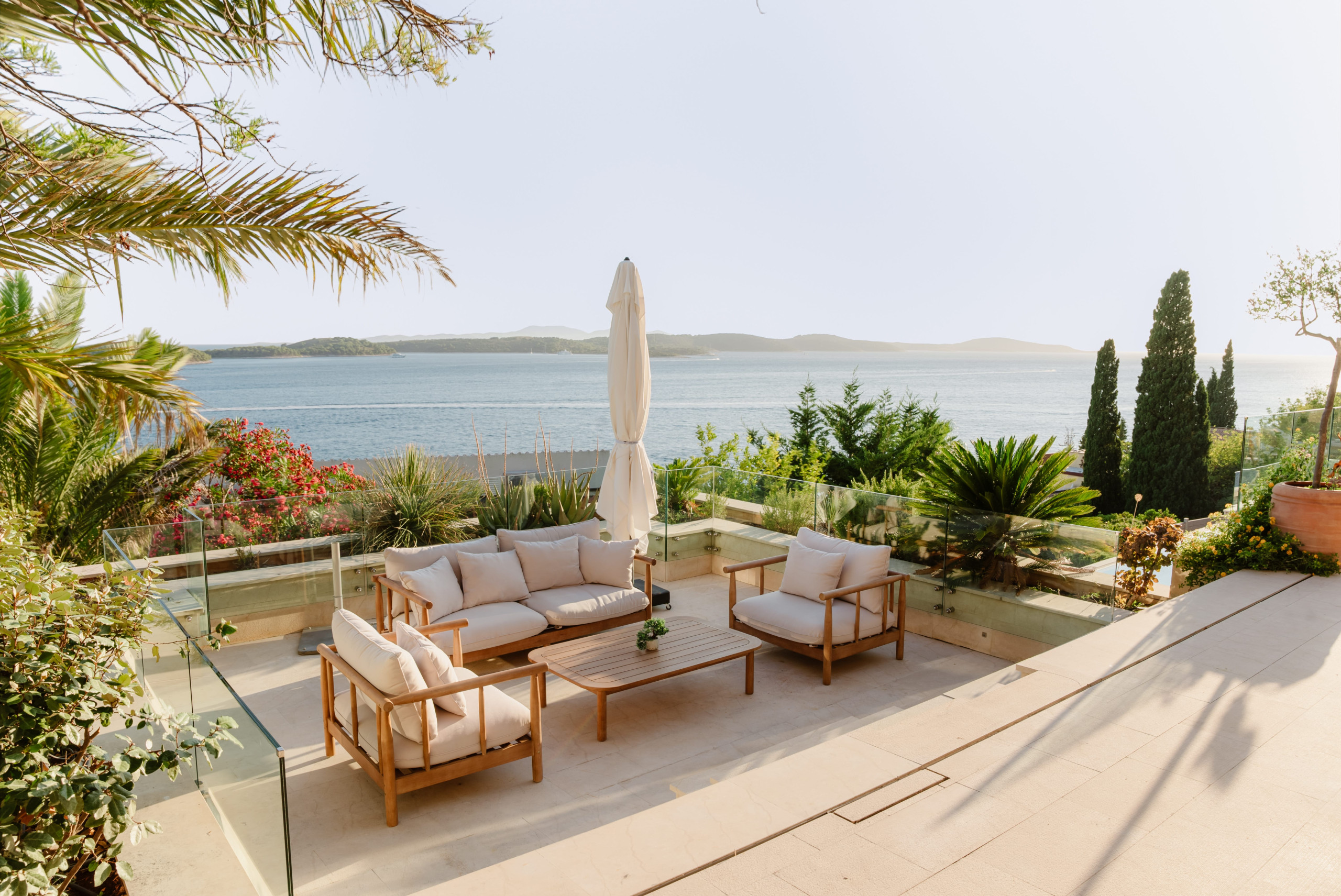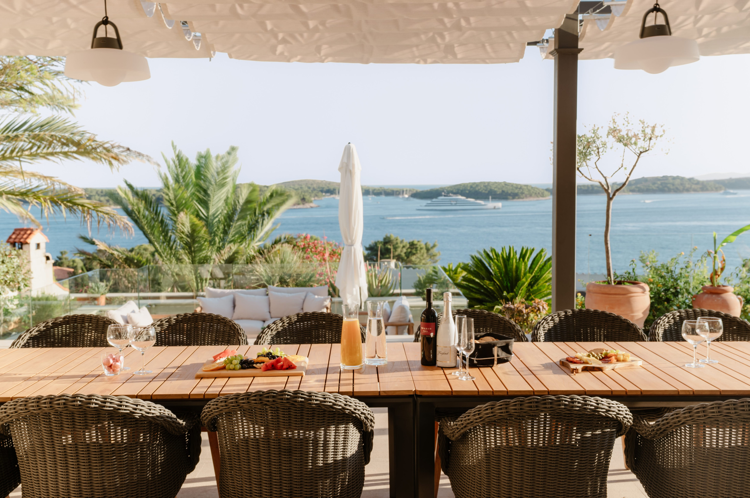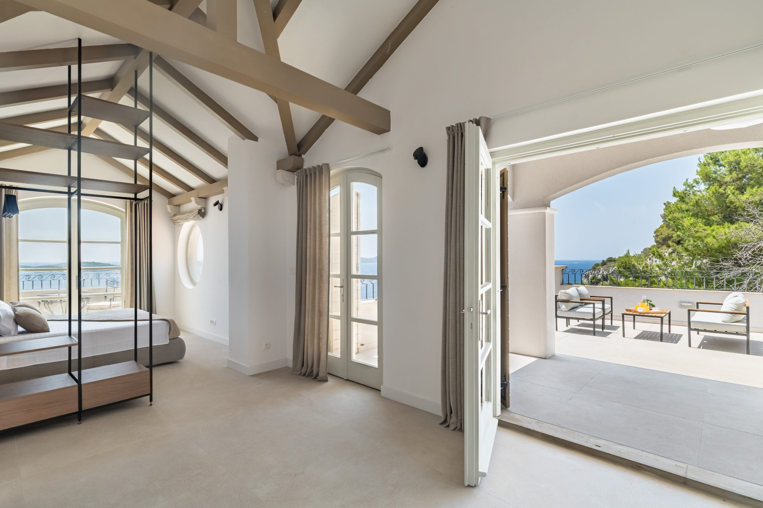 Villa Royal Hvar's first floor consists of one more king-sized bedroom with an ensuite bathroom featuring a shower and a bathtub, leading to a stunning sea-view terrace. Here you will find an additional kitchen, a dining area with a massive wooden dining table, and an entertainment area with a sofa and TV in a spacious living room. From here, you can exit to a covered terrace with a magical view of the Adriatic Sea.