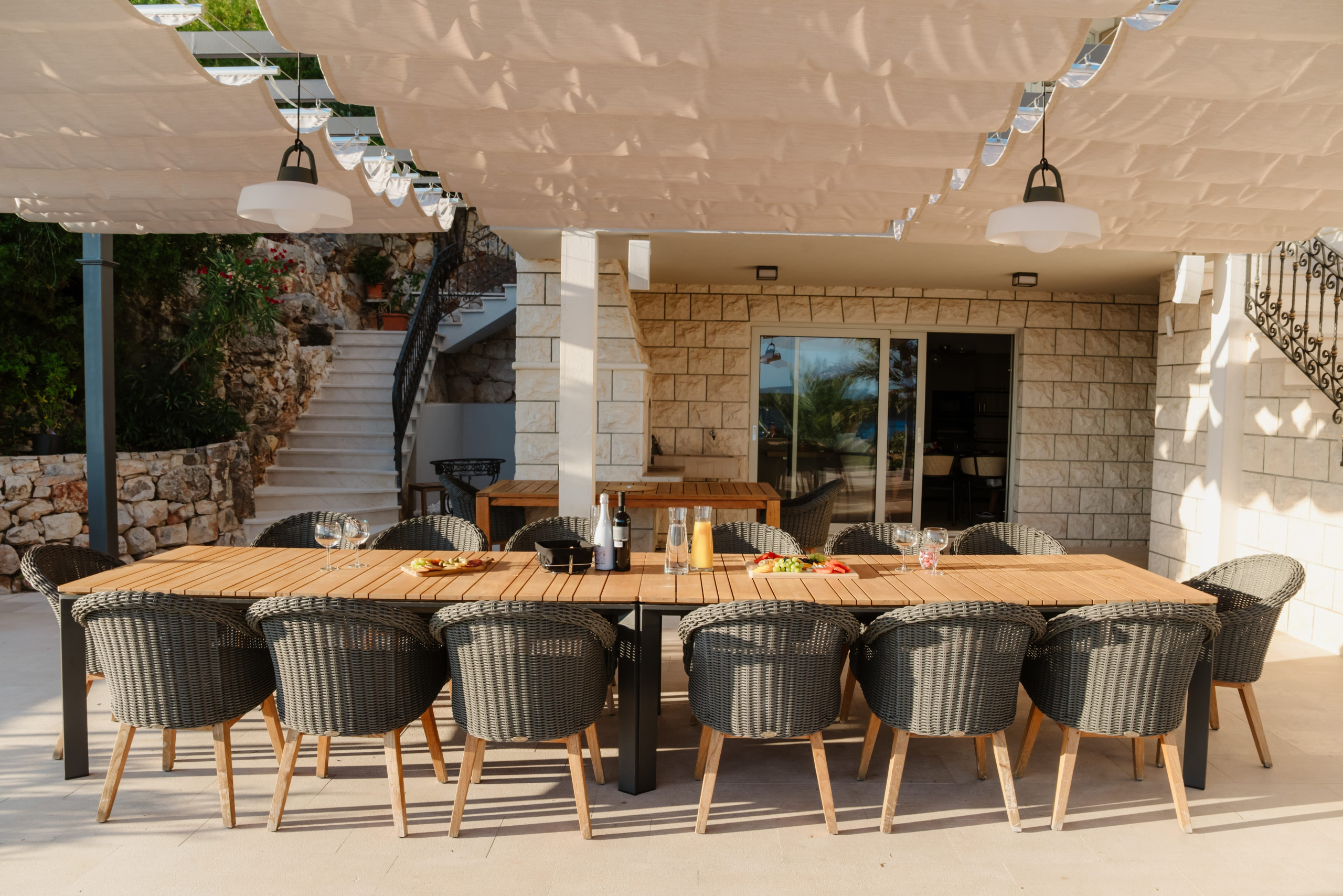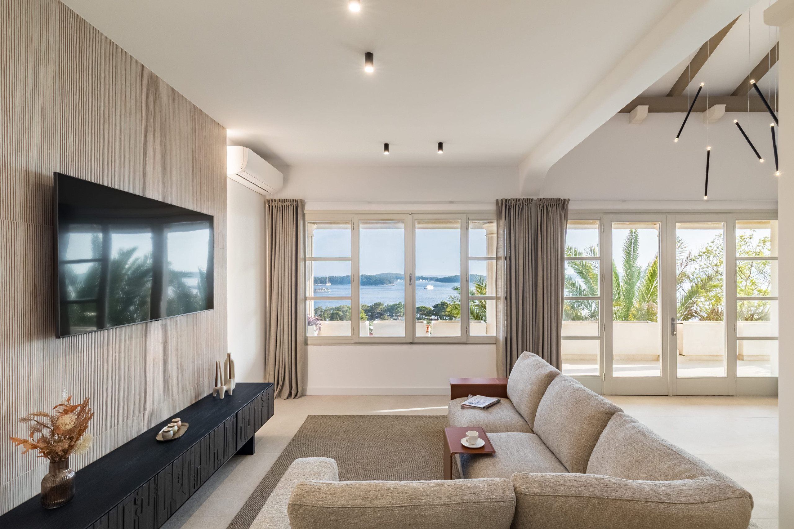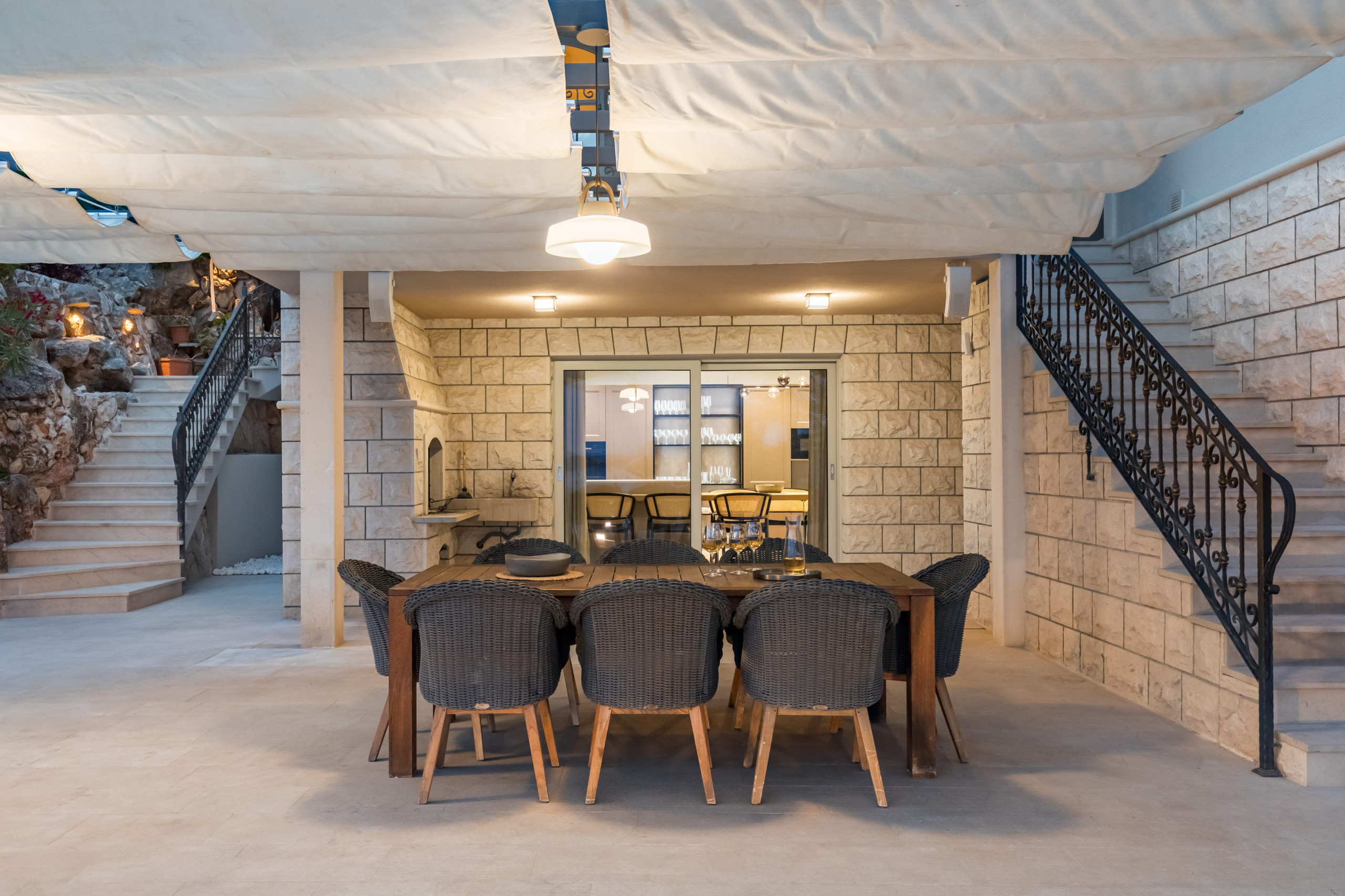 Villa Royal Hvar's first floor consists of one more king-sized bedroom with an ensuite bathroom featuring a shower and a bathtub, leading to a stunning sea-view terrace. Here you will find an additional kitchen, a dining area with a massive wooden dining table, and an entertainment area with a sofa and TV in a spacious living room. From here, you can exit to a covered terrace with a magical view of the Adriatic Sea.