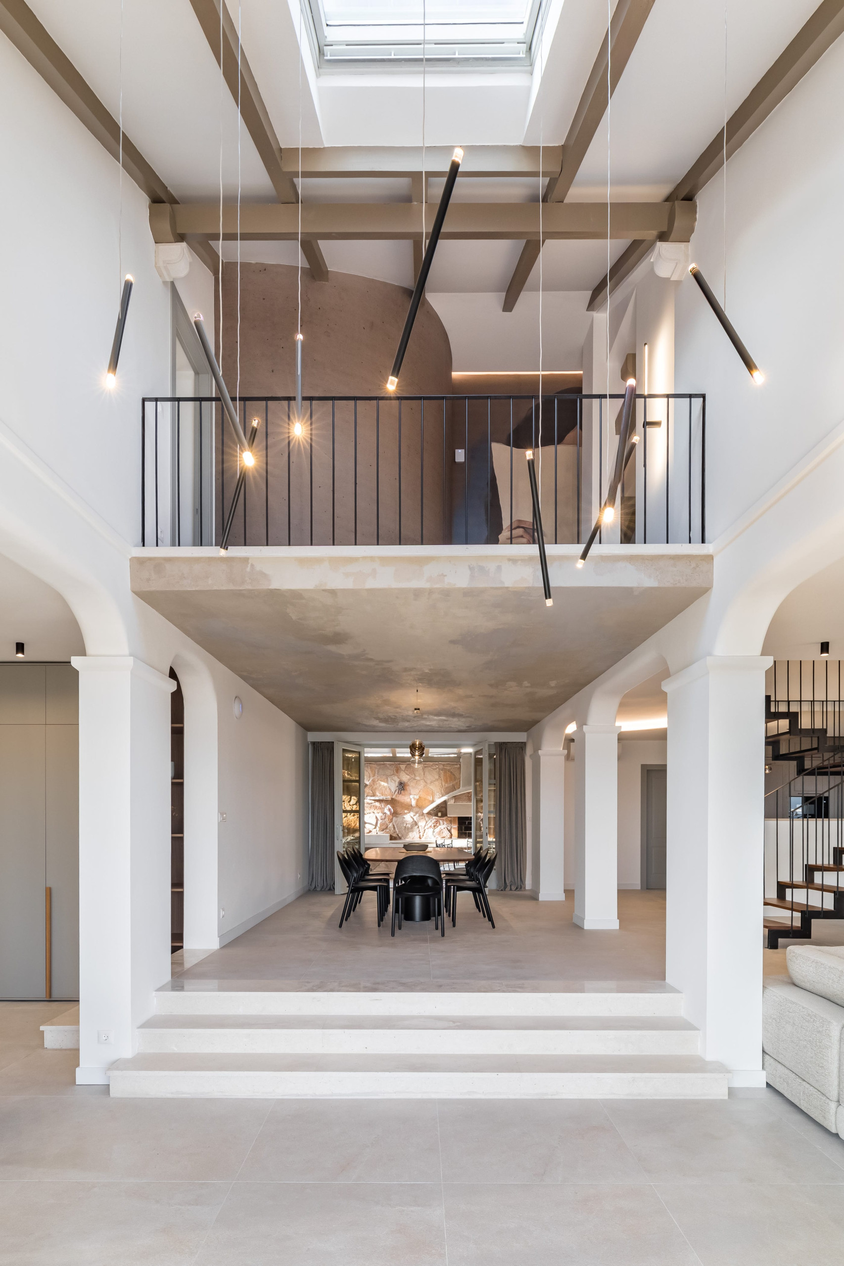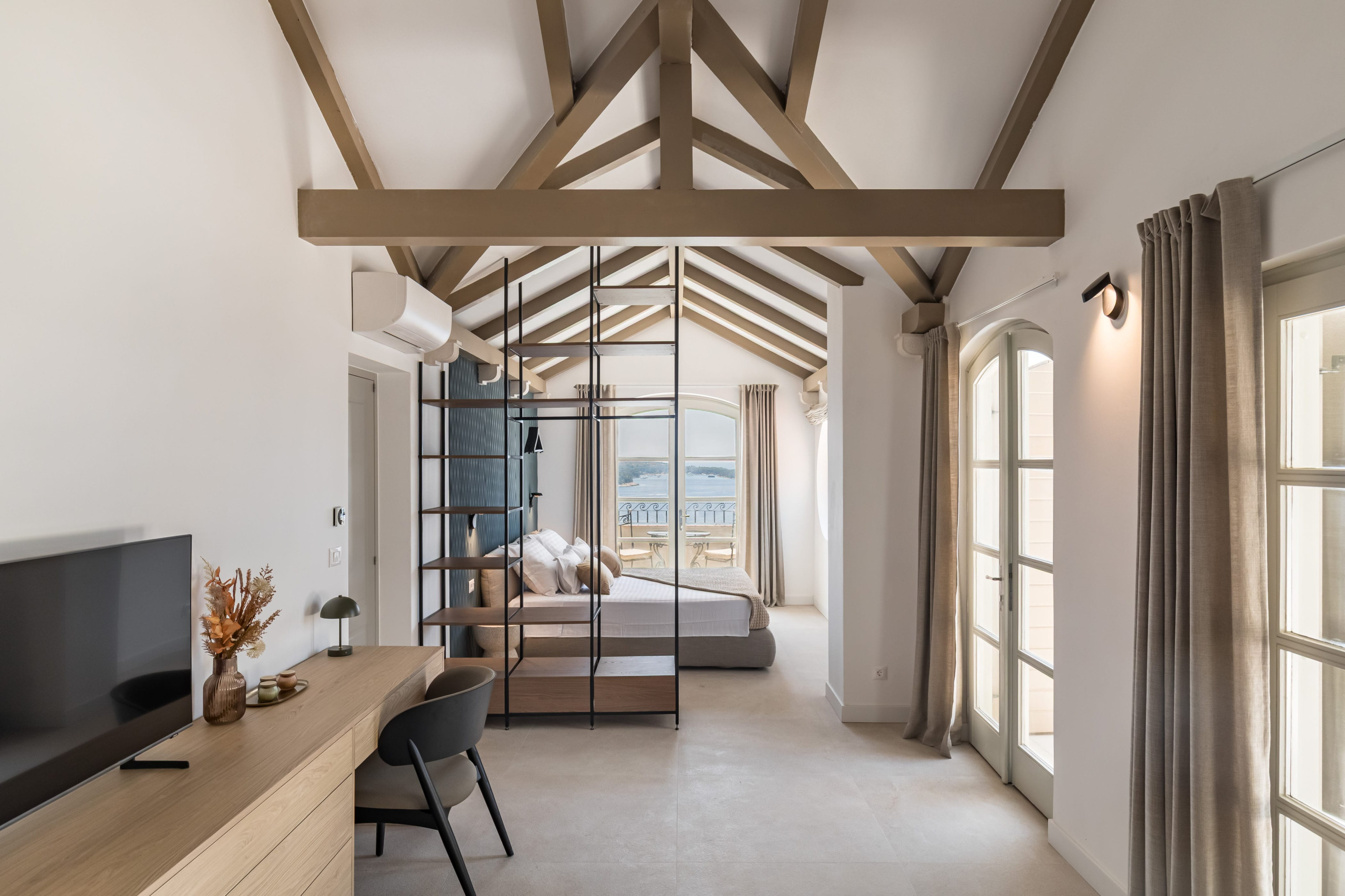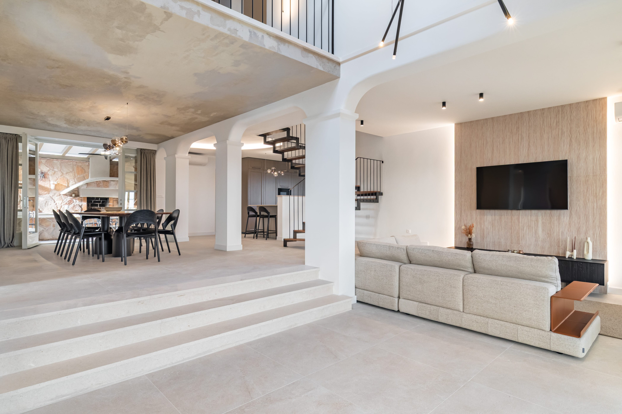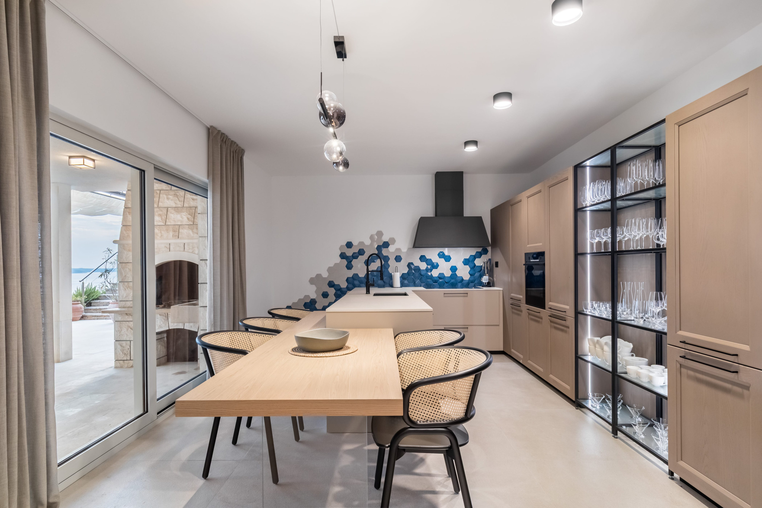 Villa Royal Hvar's first floor consists of one more king-sized bedroom with an ensuite bathroom featuring a shower and a bathtub, leading to a stunning sea-view terrace. Here you will find an additional kitchen, a dining area with a massive wooden dining table, and an entertainment area with a sofa and TV in a spacious living room. From here, you can exit to a covered terrace with a magical view of the Adriatic Sea.