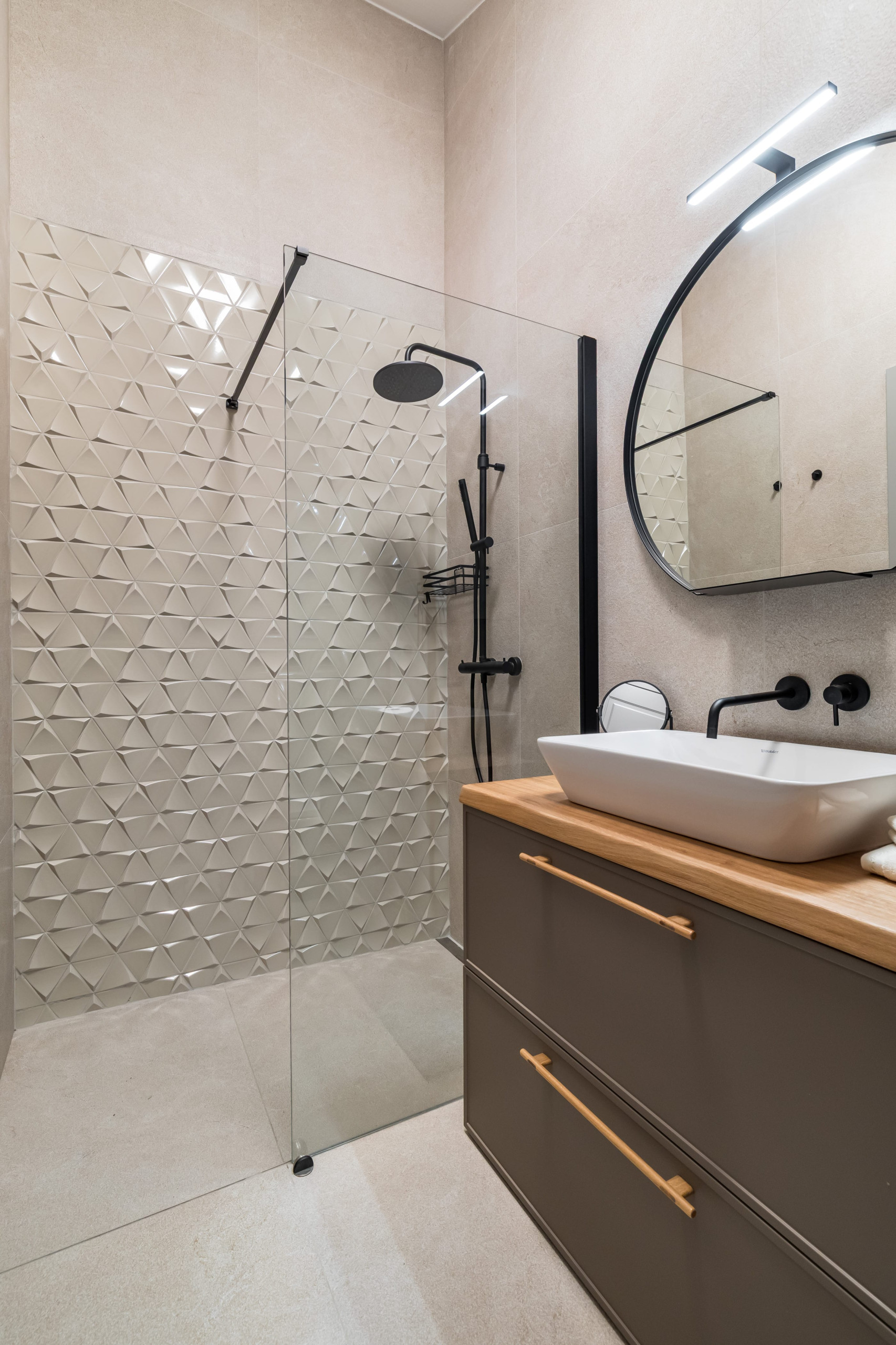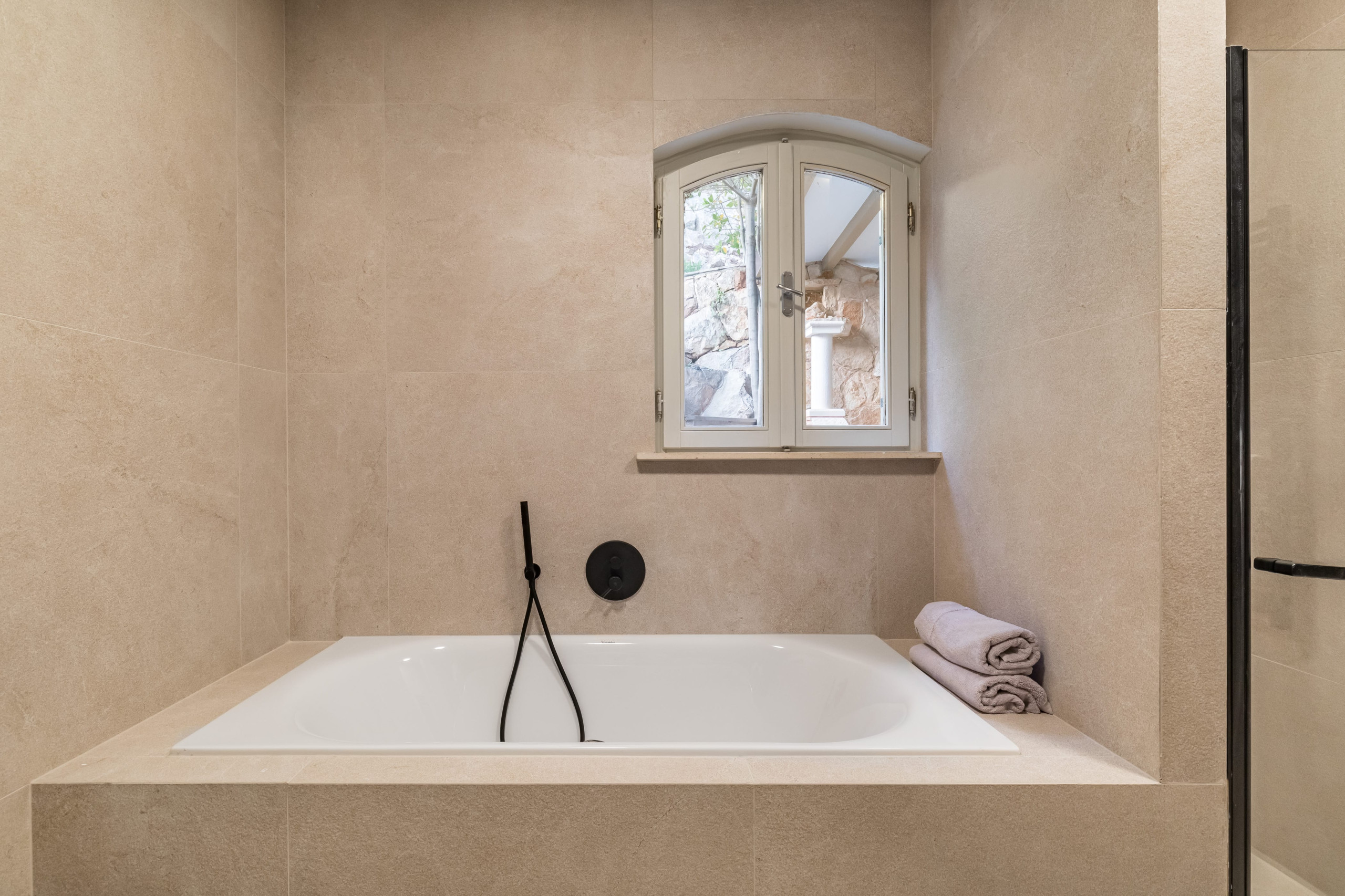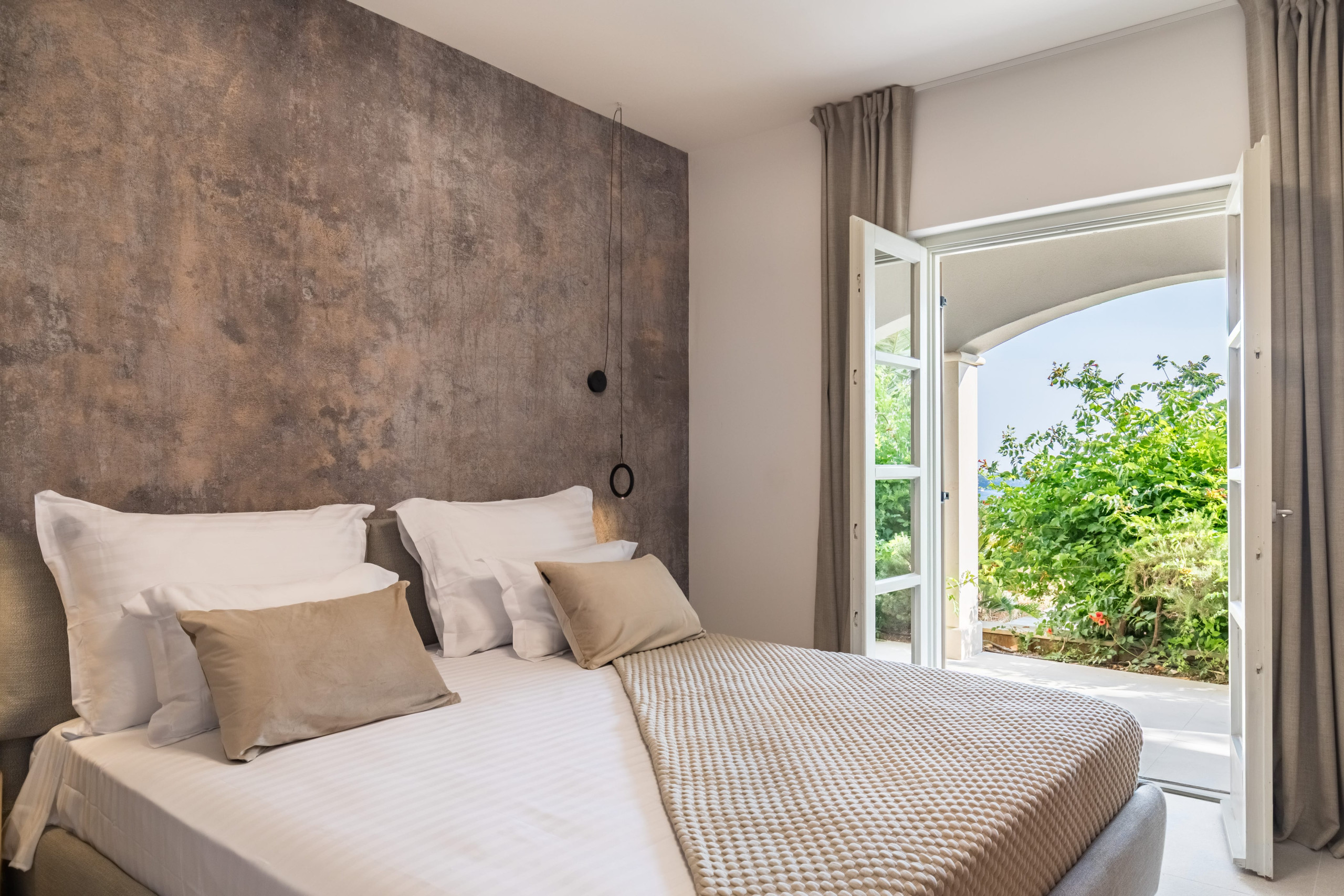 Entering this stunning villa, on the lower ground floor, you will find a laundry room. Following the ground floor area, the villa has three ensuite bedrooms. One bedroom features twin beds and an ensuite bathroom with a shower. This bedroom does not have a view, and can be used separately or as a family room. Two other bedrooms on this floor feature a king-sized bed, an ensuite bathroom, and a sea-view terrace.