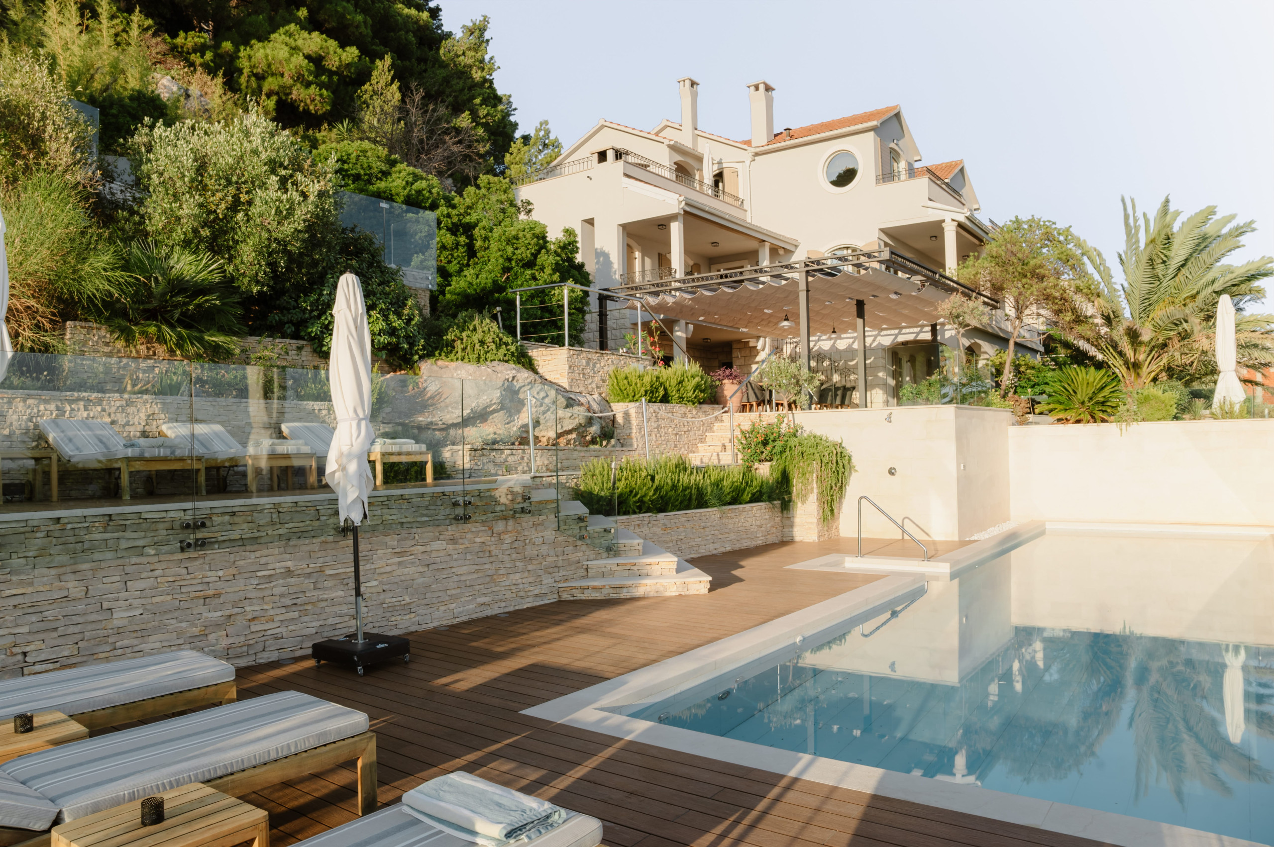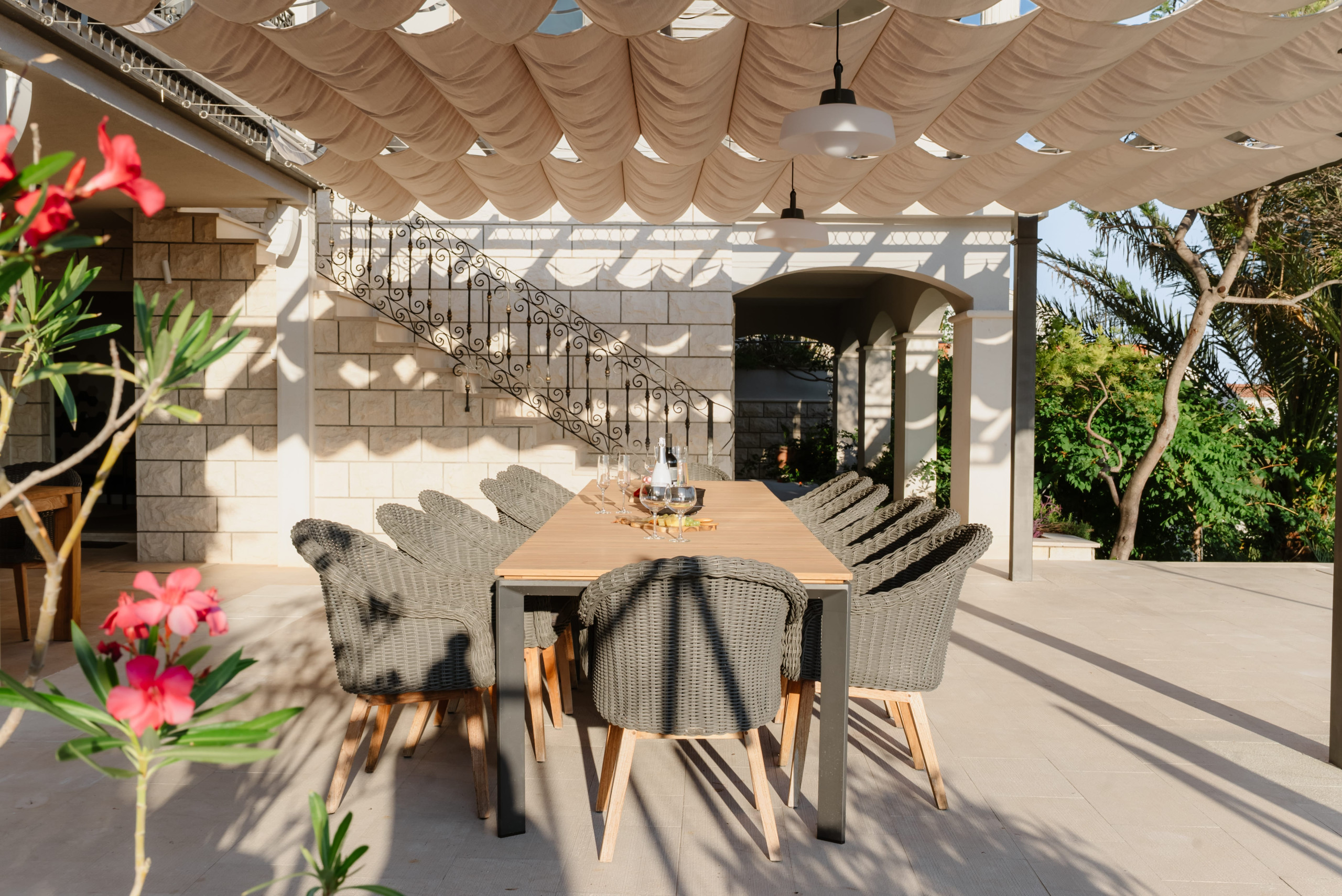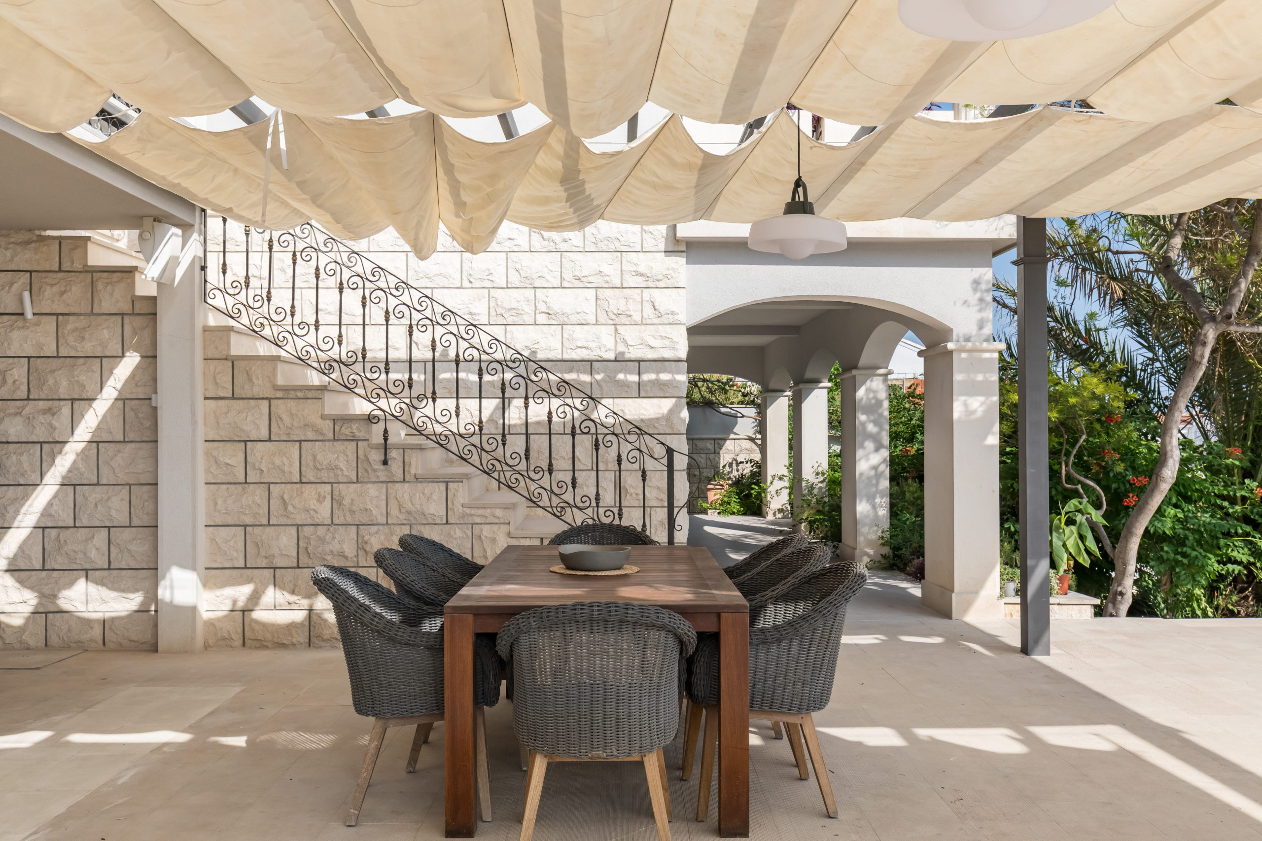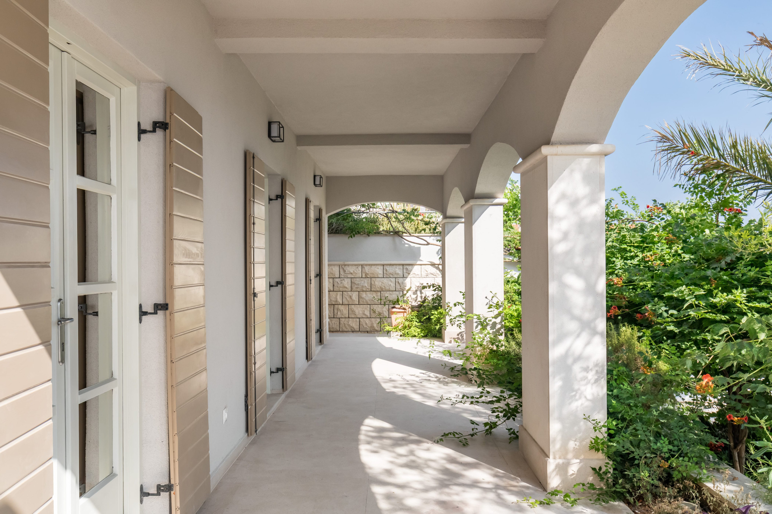 Villa's 2000-square-meter property is surrounded by a lush garden and greenery, including palms, pine, and lemon trees, in complete tranquility, with no traffic noise.