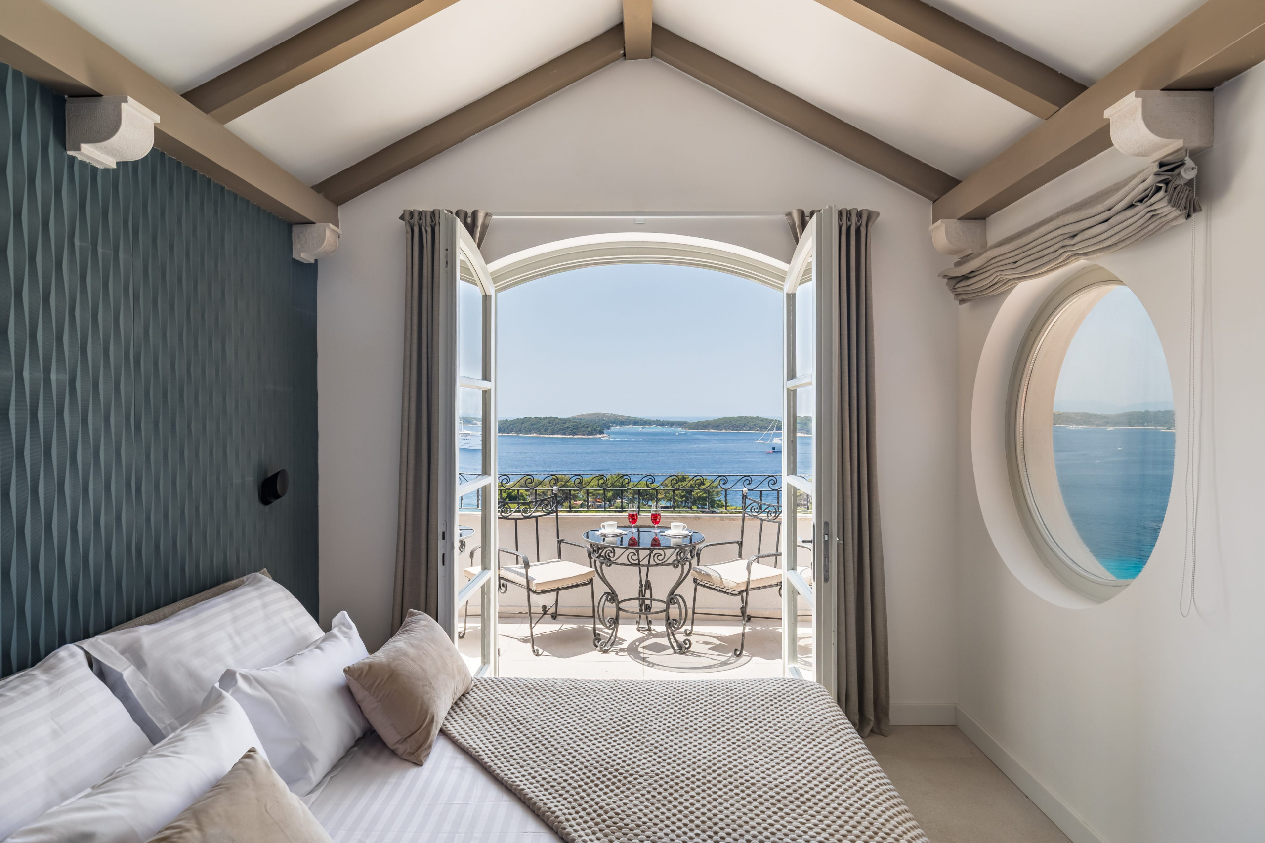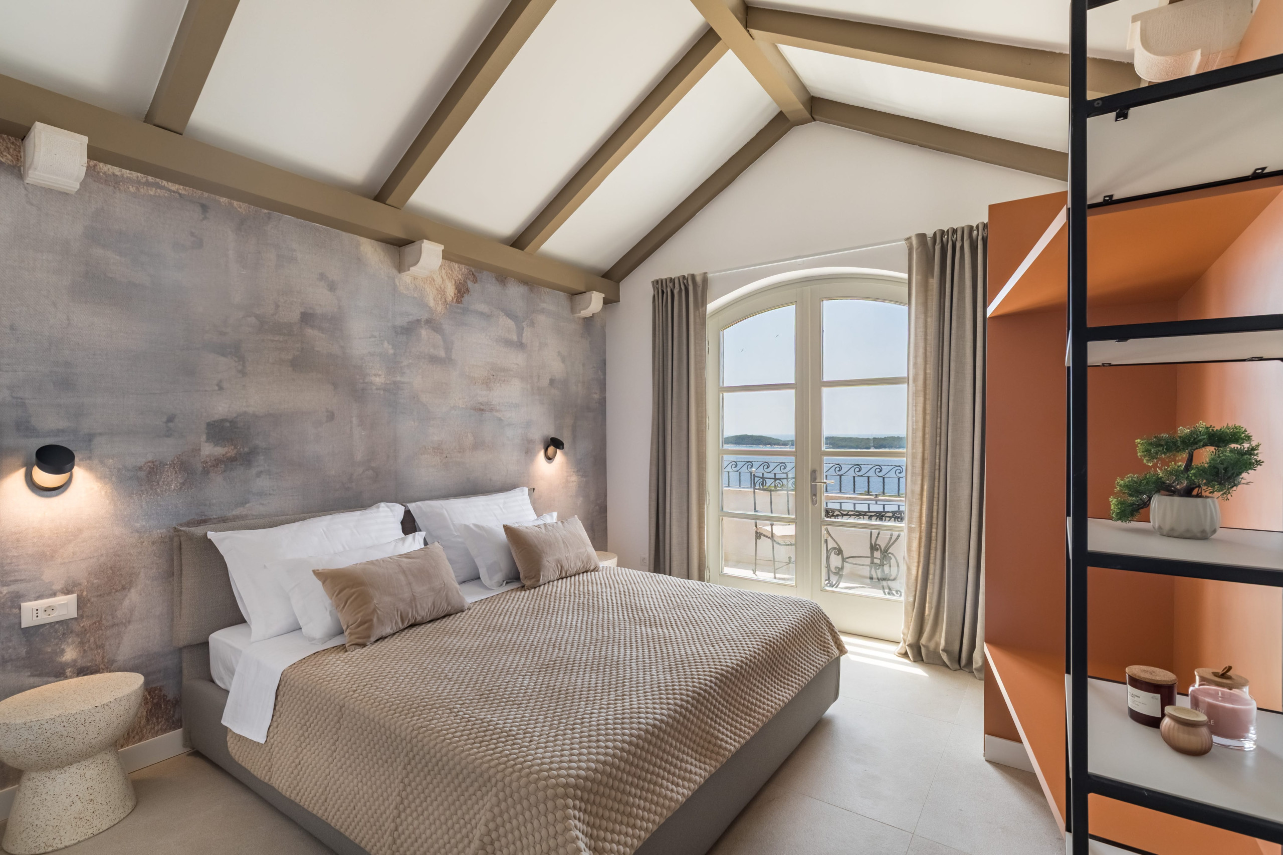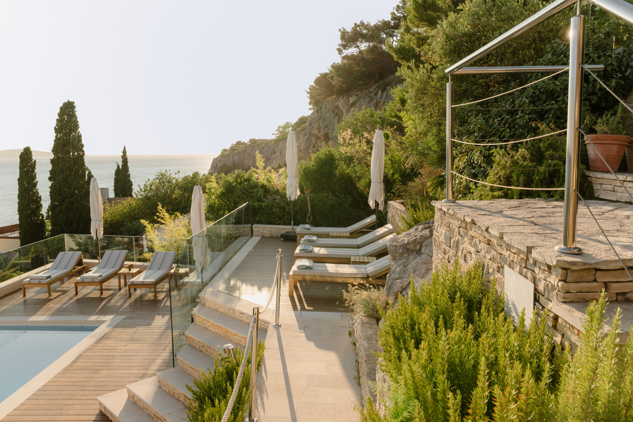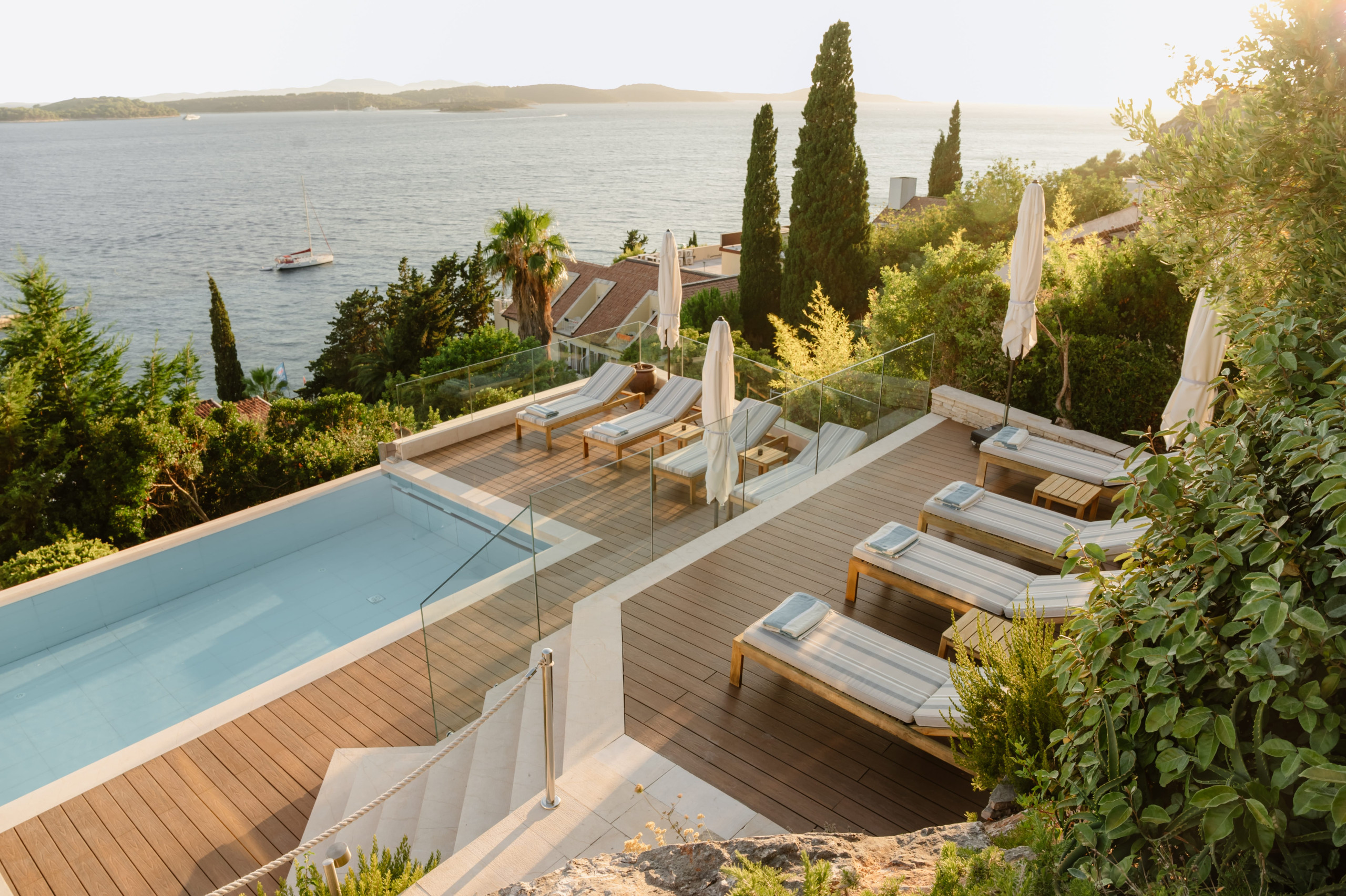 The second floor of Villa Royal Hvar is accessible via an internal staircase, where three more bedrooms are located. The first bedroom offers twin beds and an ensuite bathroom with a shower. The second bedroom has a king-sized bed and an ensuite bathroom with a shower. The third bedroom is a master suite with a lounge area, a king-sized bed, an ensuite bathroom with a shower and a bathtub, and an exit to the large private terrace with beautiful views of the bay. This floor also offers a private yoga room with mats, perfect for a completely relaxing, serene vacation on the Adriatic.