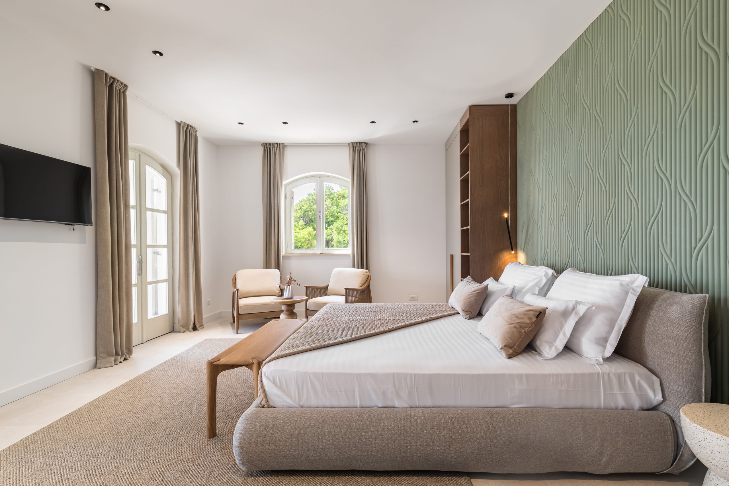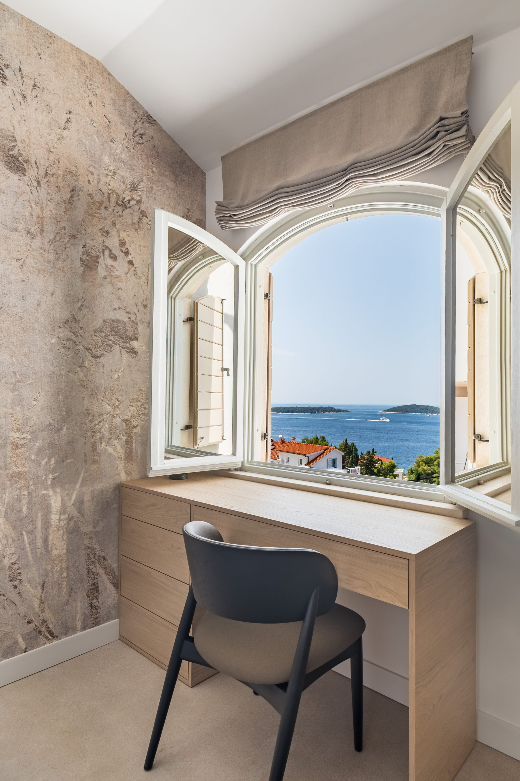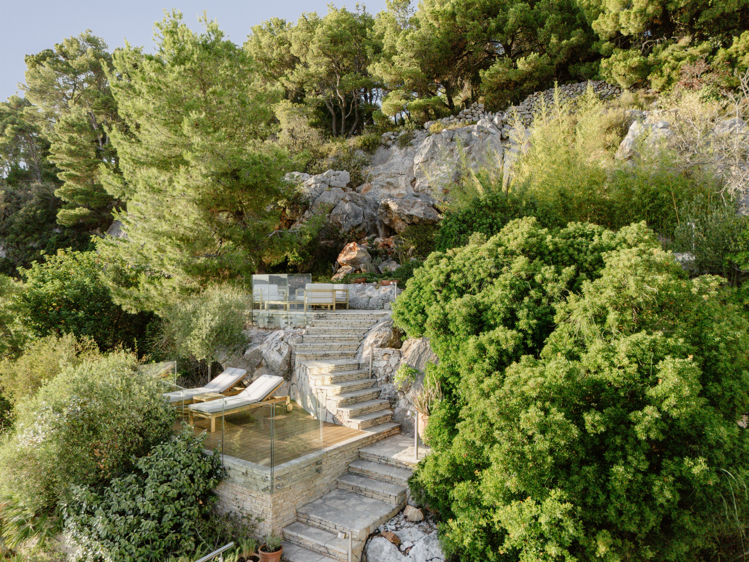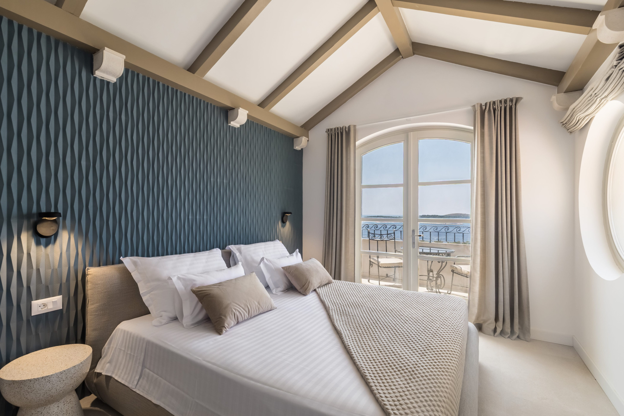 The second floor of Villa Royal Hvar is accessible via an internal staircase, where three more bedrooms are located. The first bedroom offers twin beds and an ensuite bathroom with a shower. The second bedroom has a king-sized bed and an ensuite bathroom with a shower. The third bedroom is a master suite with a lounge area, a king-sized bed, an ensuite bathroom with a shower and a bathtub, and an exit to the large private terrace with beautiful views of the bay. This floor also offers a private yoga room with mats, perfect for a completely relaxing, serene vacation on the Adriatic.